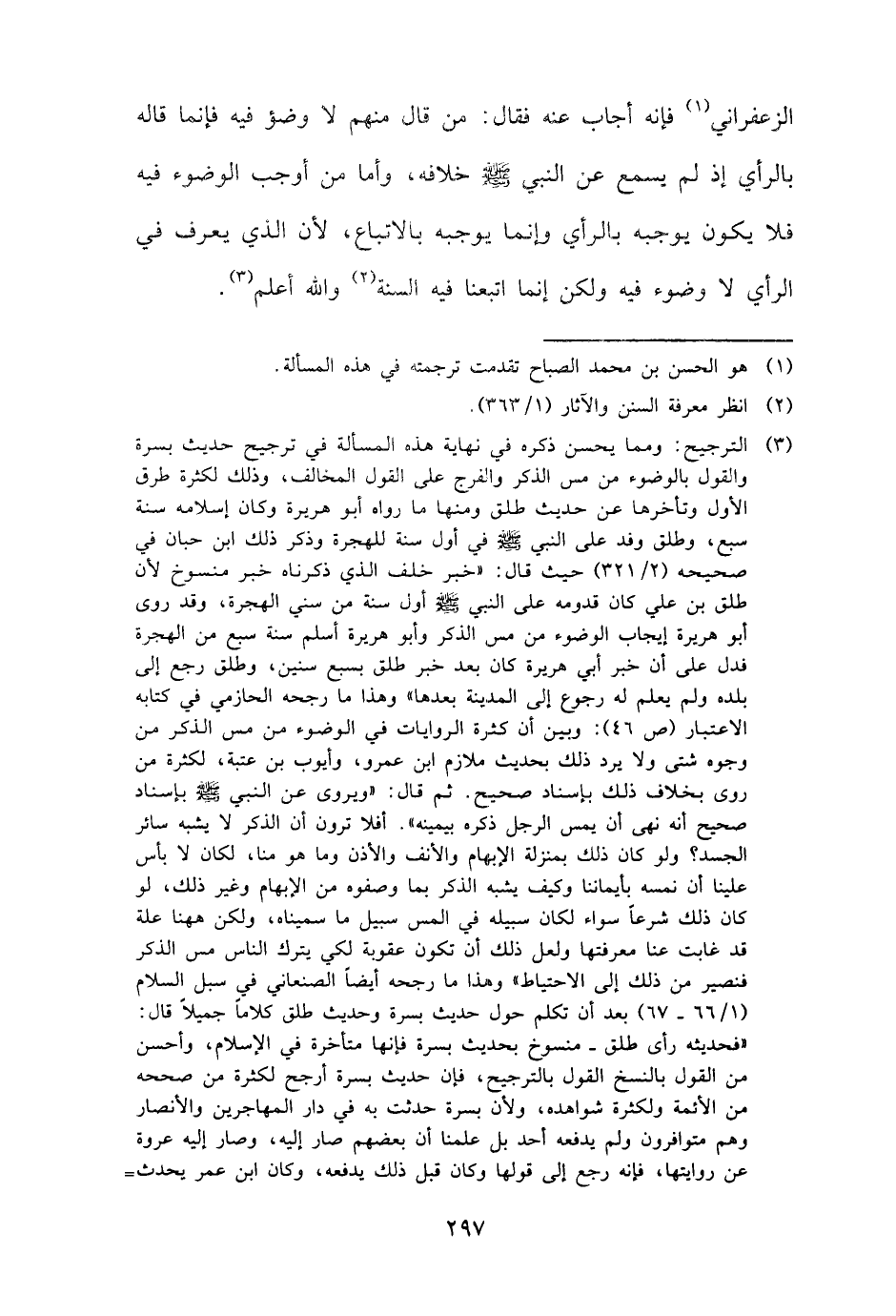 الزَّعْفَرَانِي فَإِنَّهُ أجَاب عَنهُ فَقَالَ: من قَالَ مِنْهُم لَا وضوء فِيهِ فَإِنَّمَا قَالَه بِالرَّأْيِ إِذْ لم يسمع عَن النَّبِي - صَلَّى اللَّهُ عَلَيْهِ وَسَلَّم َ - خِلَافه، وَأما من أوجب الْوضُوء فِيهِ فَلَا يكون يُوجِبهُ بِالرَّأْيِ وَإِنَّمَا يُوجِبهُ بالاتباع، لِأَن الَّذِي يعرف فِي الرَّأْي لَا وضوء فِيهِ وَلَكِن إِنَّمَا اتَّبعنَا فِيهِ السّنة وَالله أعلم.