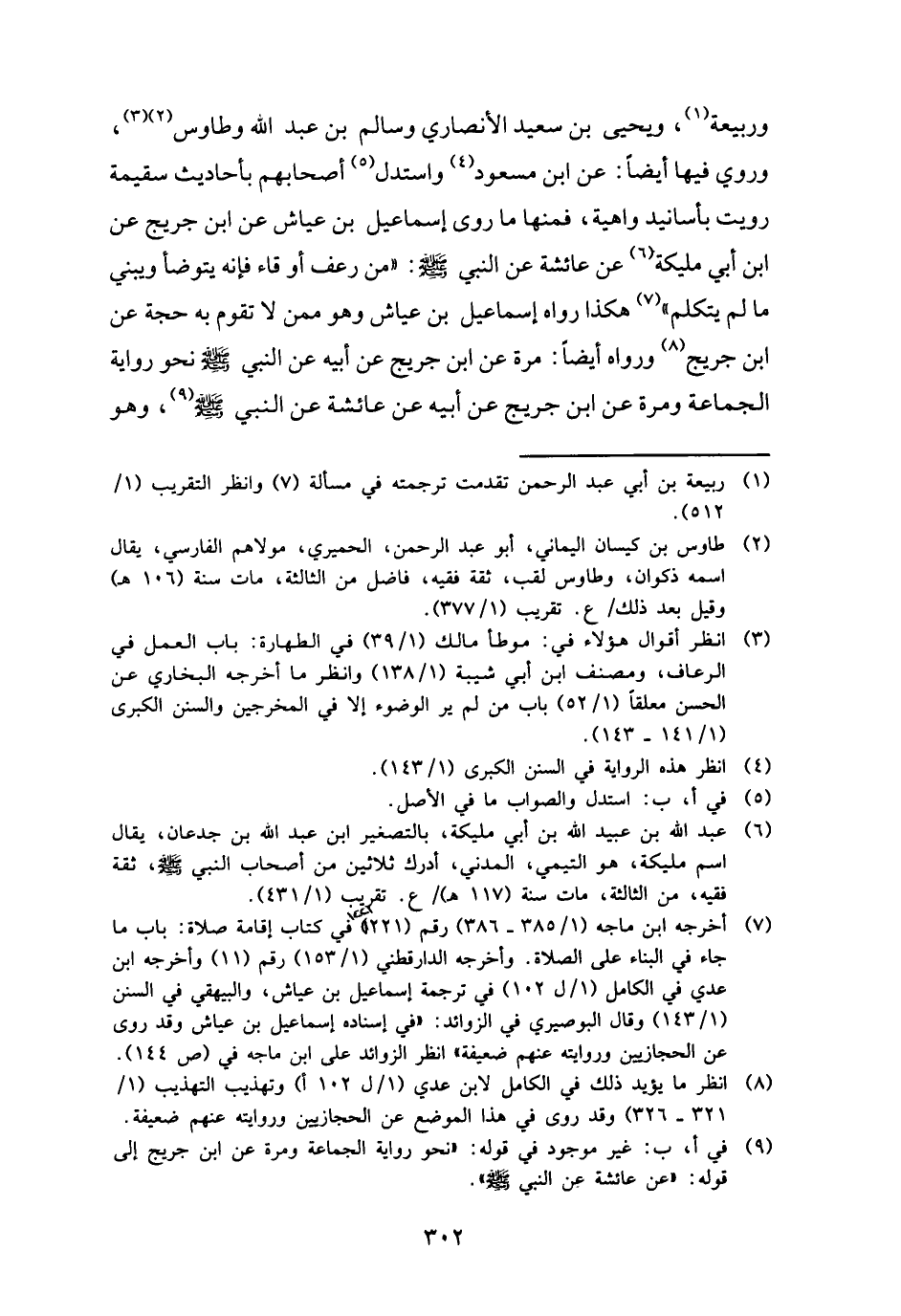 وَرَبِيعَة، وَيحيى بن سعيد الْأنْصَارِيّ وَسَالم بن عبد الله وَطَاوُس، وَرُوِيَ فِيهَا أَيْضا: عَن ابْن مَسْعُود وَاسْتدلَّ أَصْحَابهم بِأَحَادِيث سقيمة رويت بأسانيد واهية، فَمِنْهَا مَا روى إِسْمَاعِيل بن عَيَّاش عَن ابْن جريج عَن ابْن أبي مليكَة عَن عَائِشَة عَن النَّبِي - صَلَّى اللَّهُ عَلَيْهِ وَسَلَّم َ -: " من رعف أَو قاء فَإِنَّهُ يتَوَضَّأ وَيَبْنِي مَا لم يتَكَلَّم " هَكَذَا رَوَاهُ إِسْمَاعِيل بن عَيَّاش وَهُوَ مِمَّن لَا تقوم بِهِ حجَّة عَن ابْن جريج وَرَوَاهُ أَيْضا: مرّة عَن ابْن جريج عَن أَبِيه عَن النَّبِي - صَلَّى اللَّهُ عَلَيْهِ وَسَلَّم َ - نَحْو رِوَايَة الْجَمَاعَة وَمرَّة عَن ابْن جريج عَن أَبِيه عَن عَائِشَة عَن النَّبِي - صَلَّى اللَّهُ عَلَيْهِ وَسَلَّم َ -، وَهُوَ