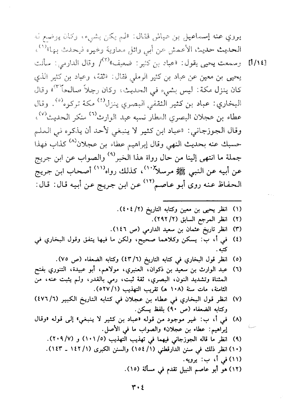 يروي عَنهُ إِسْمَاعِيل بن عَيَّاش فَقَالَ: " لم يكن بِشَيْء، وَكَانَ يوضع لَهُ الحَدِيث حَدِيث الْأَعْمَش عَن أبي وَائِل مُعَاوِيَة وَغَيره فَيحدث بهَا "، وَسمعت يحيى يَقُول: " عباد بن كثير: ضَعِيف " وَقَالَ الدَّارمِيّ: سَأَلت يحيى بن معِين عَن عباد بن كثير الرَّمْلِيّ فَقَالَ: " ثِقَة، وَعباد بن كثير الَّذِي كَانَ ينزل مَكَّة: لَيْسَ بِشَيْء فِي الحَدِيث، وَكَانَ رجلا صَالحا " وَقَالَ البُخَارِيّ: عباد بن كثير الثَّقَفِيّ الْبَصْرِيّ ينزل مَكَّة تَرَكُوهُ. وَقَالَ عَطاء بن عجلَان الْبَصْرِيّ الْعَطَّار نسبه عبد الْوَارِث مُنكر الحَدِيث، وَقَالَ الْجوزجَاني: " عباد ابْن كثير لَا يَنْبَغِي لأحد أَن يذكرهُ فِي الْعلم حَسبك عَنهُ بِحَدِيث النَّهْي وَقَالَ إِبْرَاهِيم عَطاء بن عجلَان كَذَّاب فَهَذَا جملَة مَا انْتهى إِلَيْنَا من حَال رُوَاة هَذَا الْخَبَر وَالصَّوَاب عَن ابْن جريج عَن أَبِيه عَن النَّبِي - صَلَّى اللَّهُ عَلَيْهِ وَسَلَّم َ - مُرْسلا، كَذَلِك رَوَاهُ أَصْحَاب ابْن جريج الْحفاظ عَنهُ روى أَبُو عَاصِم عَن ابْن جريج عَن أَبِيه قَالَ: قَالَ: