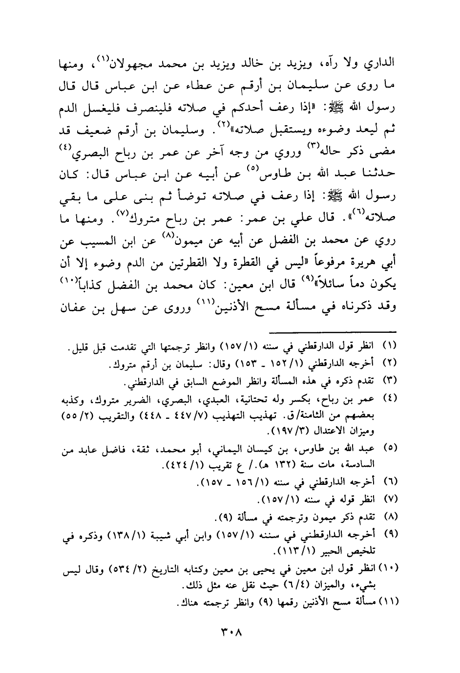الدَّارِيّ وَلَا رَآهُ، وَيزِيد بن خَالِد وَيزِيد بن مُحَمَّد مَجْهُولَانِ، وَمِنْهَا مَا رُوِيَ عَن سُلَيْمَان بن أَرقم عَن عَطاء عَن ابْن عَبَّاس قَالَ قَالَ رَسُول الله - صَلَّى اللَّهُ عَلَيْهِ وَسَلَّم َ -: " إِذا رعف أحدكُم فِي صلَاته فلينصرف فليغسل الدَّم ثمَّ ليعد وضوءه وَيسْتَقْبل صلَاته ". وَسليمَان بن أَرقم ضَعِيف قد مضى ذكر حَاله وَرُوِيَ من وَجه آخر عَن عمر بن رَبَاح الْبَصْرِيّ حَدثنَا عبد الله بن طَاوس عَن أَبِيه عَن ابْن عَبَّاس قَالَ: كَانَ رَسُول الله - صَلَّى اللَّهُ عَلَيْهِ وَسَلَّم َ -: إِذا رعف فِي صلَاته تَوَضَّأ ثمَّ بنى على مَا بَقِي صلَاته ". قَالَ عَليّ بن عمر: عمر بن رَبَاح مَتْرُوك. وَمِنْهَا مَا رُوِيَ عَن مُحَمَّد بن الْفضل عَن أَبِيه عَن مَيْمُون عَن ابْن الْمسيب عَن أبي هُرَيْرَة مَرْفُوعا " لَيْسَ فِي القطرة وَلَا القطرتين من الدَّم وضوء إِلَّا أَن يكون دَمًا سَائِلًا " قَالَ ابْن معِين: كَانَ مُحَمَّد بن الْفضل كذابا وَقد ذَكرْنَاهُ فِي مَسْأَلَة مسح الْأُذُنَيْنِ وروى عَن سهل بن عَفَّان