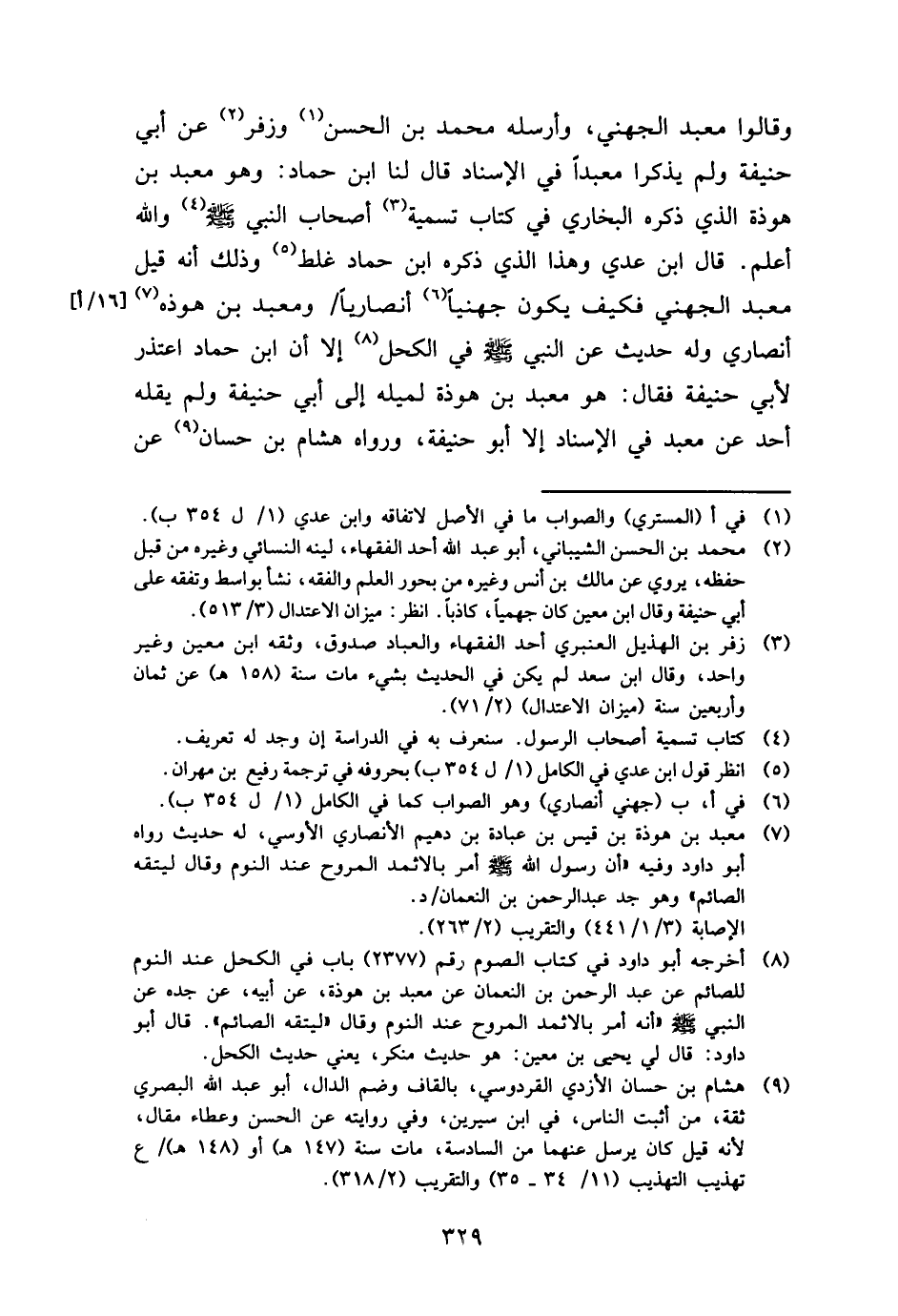وَقَالُوا معبد الْجُهَنِيّ، وأرسله مُحَمَّد بن الْحسن وَزفر عَن أبي حنيفَة وَلم يذكرَا معبدًا فِي الْإِسْنَاد قَالَ لنا ابْن حَمَّاد: وَهُوَ معبد بن هَوْذَة الَّذِي ذكره البُخَارِيّ فِي كتاب تَسْمِيَة أَصْحَاب النَّبِي - صَلَّى اللَّهُ عَلَيْهِ وَسَلَّم َ - وَالله أعلم. قَالَ ابْن عدي وَهَذَا الَّذِي ذكره ابْن حَمَّاد غلط وَذَلِكَ أَنه قيل معبد الْجُهَنِيّ فَكيف يكون جهنيا أَنْصَارِيًّا ومعبد بن هوذه أَنْصَارِي وَله حَدِيث عَن النَّبِي - صَلَّى اللَّهُ عَلَيْهِ وَسَلَّم َ - فِي الْكحل إِلَّا أَن ابْن حَمَّاد اعتذر لأبي حنيفَة فَقَالَ: هُوَ معبد بن هَوْذَة لميله إِلَى أبي حنيفَة وَلم يقلهُ أحد عَن معبد فِي الْإِسْنَاد إِلَّا أَبُو حنيفَة، وَرَوَاهُ هِشَام بن حسان عَن