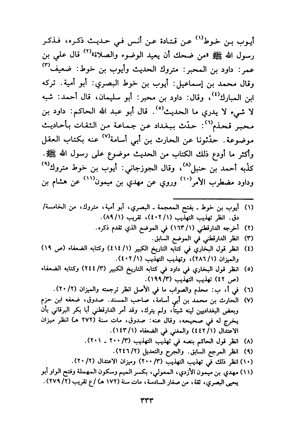 أَيُّوب بن خوط عَن قَتَادَة عَن أنس فِي حَدِيث ذكره، فَذكر رَسُول الله - صَلَّى اللَّهُ عَلَيْهِ وَسَلَّم َ - " من ضحك أَن يُعِيد الْوضُوء وَالصَّلَاة " قَالَ عَليّ بن عمر: دَاوُد بن المحبر: مَتْرُوك الحَدِيث وَأَيوب بن خوط: ضَعِيف وَقَالَ مُحَمَّد بن إِسْمَاعِيل: أَيُّوب بن خوط الْبَصْرِيّ: أَبُو أُميَّة. تَركه ابْن الْمُبَارك، وَقَالَ: دَاوُد بن محبر: أَبُو سُلَيْمَان، قَالَ أَحْمد: شبه لَا شَيْء لَا يدْرِي مَا الحَدِيث. قَالَ أَبُو عبد الله الْحَاكِم: دَاوُد بن محبر قحذم: حدث بِبَغْدَاد عَن جمَاعَة من الثِّقَات بِأَحَادِيث مَوْضُوعَة. حدثونا عَن الْحَارِث بن أبي أُسَامَة عَنهُ بِكِتَاب الْعقل وَأكْثر مَا أودع ذَلِك الْكتاب من الحَدِيث مَوْضُوع على رَسُول الله - صَلَّى اللَّهُ عَلَيْهِ وَسَلَّم َ -. كذبه أَحْمد بن حَنْبَل، وَقَالَ الْجوزجَاني: أَيُّوب بن خوط مَتْرُوك وَدَاوُد مُضْطَرب الْأَمر وَرُوِيَ عَن مهْدي بن مَيْمُون عَن هِشَام بن