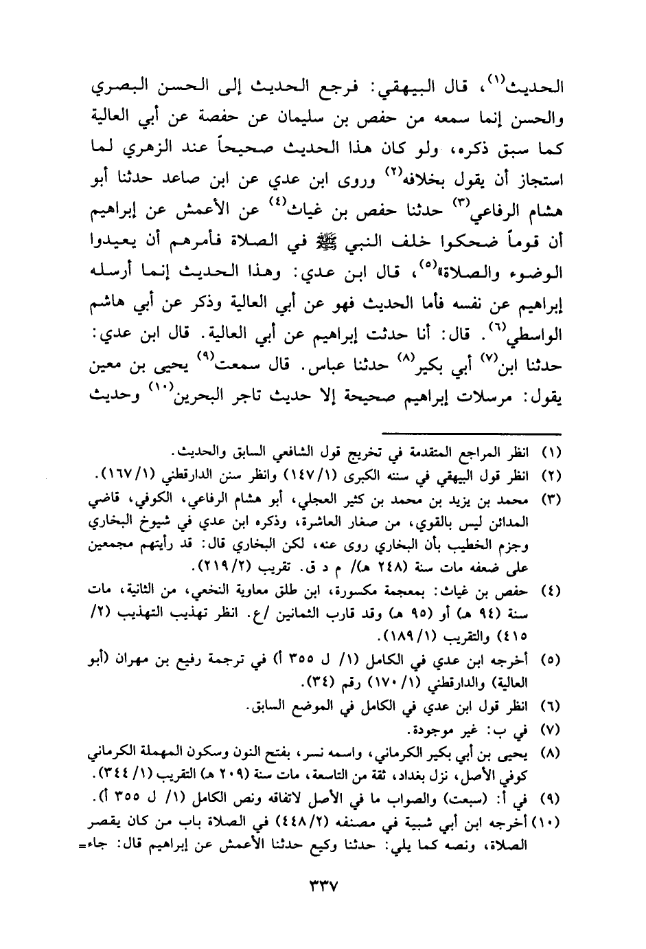 الحَدِيث، قَالَ الْبَيْهَقِيّ: فَرجع الحَدِيث إِلَى الْحسن الْبَصْرِيّ وَالْحسن إِنَّمَا سَمعه من حَفْص بن سُلَيْمَان عَن حَفْصَة عَن أبي الْعَالِيَة كَمَا سبق ذكره، وَلَو كَانَ هَذَا الحَدِيث صَحِيحا عِنْد الزُّهْرِيّ لما استجاز أَن يَقُول بِخِلَافِهِ وروى ابْن عدي عَن ابْن صاعد حَدثنَا أَبُو هِشَام الرِّفَاعِي حَدثنَا حَفْص بن غياث عَن الْأَعْمَش عَن إِبْرَاهِيم أَن قوما ضحكوا خلف النَّبِي - صَلَّى اللَّهُ عَلَيْهِ وَسَلَّم َ - فِي الصَّلَاة فَأَمرهمْ أَن يُعِيدُوا الْوضُوء وَالصَّلَاة "، قَالَ ابْن عدي: وَهَذَا الحَدِيث إِنَّمَا أرْسلهُ إِبْرَاهِيم عَن نَفسه فَأَما الحَدِيث فَهُوَ عَن أبي الْعَالِيَة وَذكر عَن أبي هَاشم الوَاسِطِيّ. قَالَ: أَنا حدثت إِبْرَاهِيم عَن أبي الْعَالِيَة. قَالَ ابْن عدي: حَدثنَا ابْن أبي بكير حَدثنَا عَبَّاس. قَالَ سَمِعت يحيى بن معِين يَقُول: مرسلات إِبْرَاهِيم صَحِيحَة إِلَّا حَدِيث تَاجر الْبَحْرين وَحَدِيث