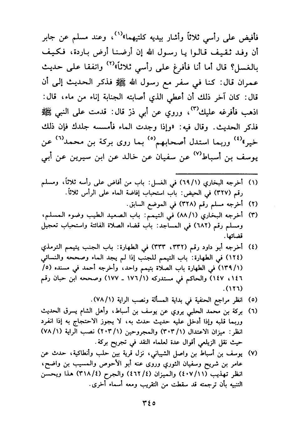 فأفيض على رَأْسِي ثَلَاثًا وَأَشَارَ بيدَيْهِ كلتيهما "، وَعند مُسلم عَن جَابر أَن وَفد ثَقِيف قَالُوا يَا رَسُول الله إِن أَرْضنَا أَرض بَارِدَة، فَكيف بِالْغسْلِ؟ قَالَ أما أَنا فأفرغ على رَأْسِي ثَلَاثًا " واتفقا على حَدِيث عمرَان قَالَ: كُنَّا فِي سفر مَعَ رَسُول الله - صَلَّى اللَّهُ عَلَيْهِ وَسَلَّم َ - فَذكر الحَدِيث إِلَى أَن قَالَ: كَانَ آخر ذَلِك أَن أعطي الَّذِي أَصَابَته الْجَنَابَة إِنَاء من مَاء، قَالَ: اذْهَبْ فأفرغه عَلَيْك، وَرُوِيَ عَن أبي ذَر قَالَ: قدمت على النَّبِي - صَلَّى اللَّهُ عَلَيْهِ وَسَلَّم َ - فَذكر الحَدِيث. وَقَالَ فِيهِ: " وَإِذا وجدت المَاء فأمسسه جِلْدك فَإِن ذَلِك خير " وَرُبمَا اسْتدلَّ أَصْحَابهم بِمَا روى بركَة بن مُحَمَّد عَن يُوسُف بن أَسْبَاط عَن سُفْيَان عَن خَالِد عَن ابْن سِيرِين عَن أبي