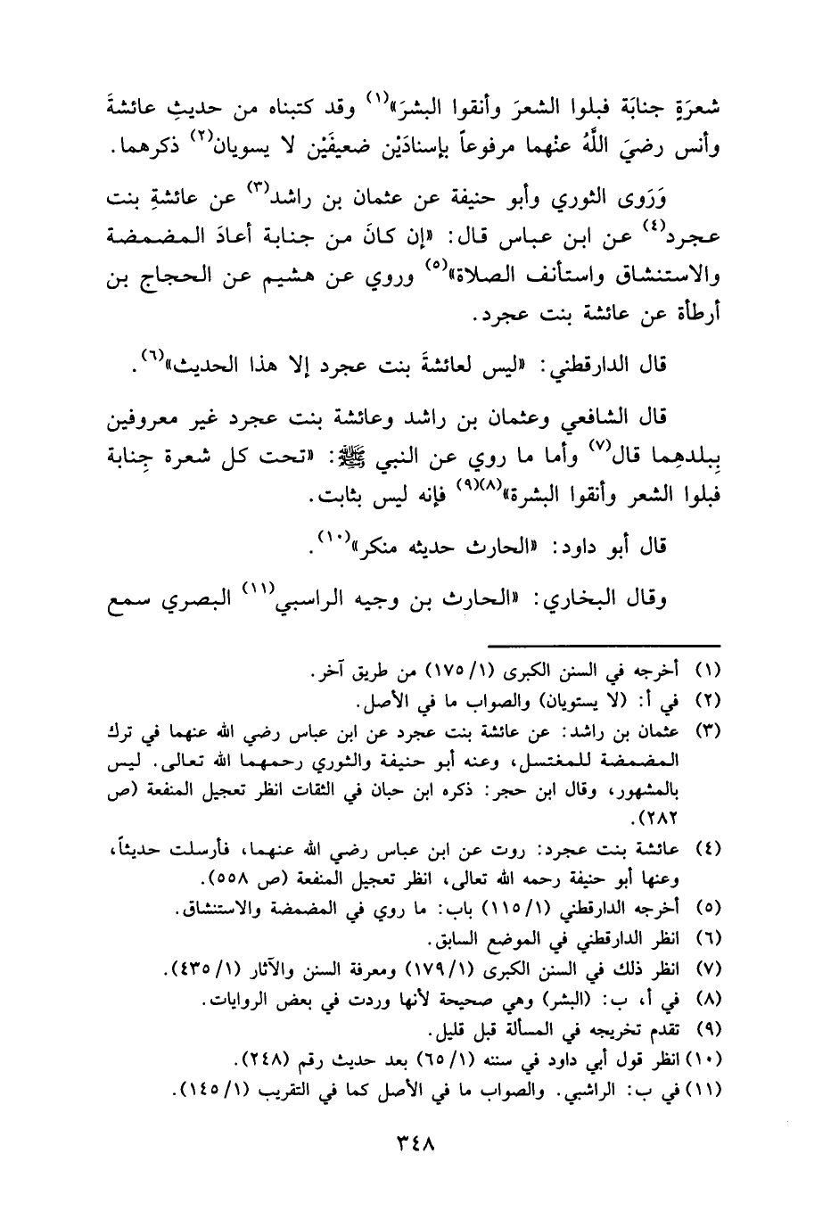 قَالَ الشَّافِعِي وَعُثْمَان بن رَاشد وَعَائِشَة بنت عجرد غير معروفين ببلدهما قَالَ وَأما مَا رُوِيَ عَن النَّبِي - صَلَّى اللَّهُ عَلَيْهِ وَسَلَّم َ -: " تَحت كل شَعْرَة جَنَابَة فبلوا الشّعْر وأنقوا الْبشرَة " فَإِنَّهُ لَيْسَ بِثَابِت.