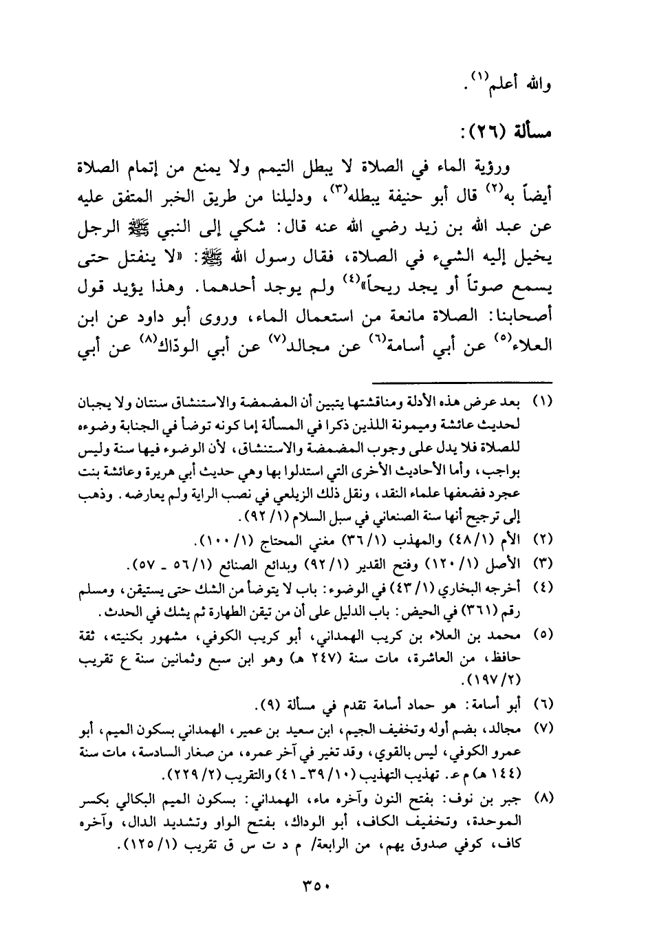 ورؤية المَاء فِي الصَّلَاة لَا يبطل التَّيَمُّم وَلَا يمْنَع من إتْمَام الصَّلَاة أَيْضا بِهِ قَالَ أَبُو حنيفَة يُبطلهُ، وَدَلِيلنَا من طَرِيق الْخَبَر الْمُتَّفق عَلَيْهِ عَن عبد الله بن زيد رَضِي الله عَنهُ قَالَ: شكي إِلَى النَّبِي - صَلَّى اللَّهُ عَلَيْهِ وَسَلَّم َ - الرجل يخيل إِلَيْهِ الشَّيْء فِي الصَّلَاة، فَقَالَ رَسُول الله - صَلَّى اللَّهُ عَلَيْهِ وَسَلَّم َ -: " لَا يَنْفَتِل حَتَّى يسمع صَوتا أَو يجد ريحًا " وَلم يُوجد أَحدهمَا. وَهَذَا يُؤَيّد قَول أَصْحَابنَا: الصَّلَاة مَانِعَة من اسْتِعْمَال المَاء، وروى أَبُو دَاوُد عَن ابْن الْعَلَاء عَن أبي أُسَامَة عَن مجَالد عَن أبي الوداك عَن أبي