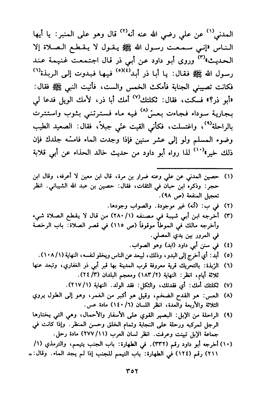 الْمدنِي عَن عَليّ رَضِي الله عَنهُ أَنه قَالَ وَهُوَ على الْمِنْبَر: يَا أَيهَا النَّاس " إِنِّي سَمِعت رَسُول الله - صَلَّى اللَّهُ عَلَيْهِ وَسَلَّم َ - يَقُول لَا يقطع الصَّلَاة إِلَّا الحَدِيث " وروى أَبُو دَاوُد عَن أبي ذَر قَالَ اجْتمعت غنيمَة عِنْد رَسُول الله - صَلَّى اللَّهُ عَلَيْهِ وَسَلَّم َ - فَقَالَ: يَا أَبَا ذَر أَبَد فِيهَا فبدوت إِلَى الربذَة فَكَانَت تصيبني الْجَنَابَة فأمكث الْخمس والست، فَأتيت النَّبِي - صَلَّى اللَّهُ عَلَيْهِ وَسَلَّم َ - فَقَالَ: " أَبُو ذَر؟ " فَسكت، فَقَالَ: ثكلتك أمك أَبَا ذَر، لأمك الويل فَدَعَا لي بِجَارِيَة سَوْدَاء فَجَاءَت بعس فِيهِ مَاء فسترتني بِثَوْب واستترت بالراحلة، وَاغْتَسَلت، فَكَأَنِّي ألقيت عني جبلا، فَقَالَ: الصَّعِيد الطّيب وضوء الْمُسلم وَلَو إِلَى عشر سِنِين فَإِذا وجدت المَاء فأمسه جِلْدك فَإِن ذَلِك خير " لذا رَوَاهُ أَبُو دَاوُد من حَدِيث خَالِد الْحذاء عَن أبي قلَابَة