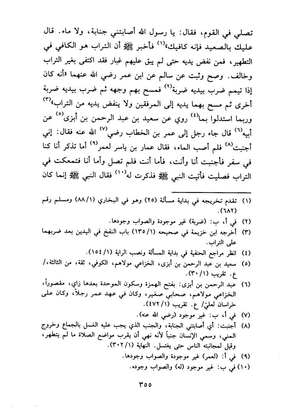 تصلي فِي الْقَوْم، فَقَالَ: يَا رَسُول الله أصابتني جَنَابَة، وَلَا مَاء. قَالَ عَلَيْك بالصعيد فَإِنَّهُ كافيك " فَأخْبر - صَلَّى اللَّهُ عَلَيْهِ وَسَلَّم َ - أَن التُّرَاب هُوَ الْكَافِي فِي التَّطْهِير، فَمن نفض يَدَيْهِ حَتَّى لم يبْق عَلَيْهِم غُبَار فقد اكْتفى بِغَيْر التُّرَاب وَخَالف. وَصَحَّ وَثَبت عَن سَالم عَن ابْن عمر رَضِي الله عَنْهُمَا " أَنه كَانَ إِذا تيَمّم ضرب بيدَيْهِ ضَرْبَة فَمسح بهم وَجهه ثمَّ ضرب بيدَيْهِ ضَرْبَة أُخْرَى ثمَّ مسح بهما يَدَيْهِ إِلَى الْمرْفقين وَلَا ينفض يَدَيْهِ من التُّرَاب " وَرُبمَا استدلوا بِمَا رُوِيَ عَن سعيد بن عبد الرَّحْمَن بن أَبْزَى عَن أَبِيه قَالَ جَاءَ رجل إِلَى عمر بن الْخطاب رَضِي الله عَنهُ فَقَالَ: إِنِّي أجنبت فَلم أصب المَاء، فَقَالَ عمار بن يَاسر لعمر أما تذكر أَنا كُنَّا فِي سفر فأجنبت أَنا وَأَنت، فَأَما أَنْت فَلم تصل وَأما أَنا فتمعكت فِي التُّرَاب فَصليت فَأتيت النَّبِي - صَلَّى اللَّهُ عَلَيْهِ وَسَلَّم َ - فَذكرت لَهُ فَقَالَ النَّبِي - صَلَّى اللَّهُ عَلَيْهِ وَسَلَّم َ - إِنَّمَا كَانَ
