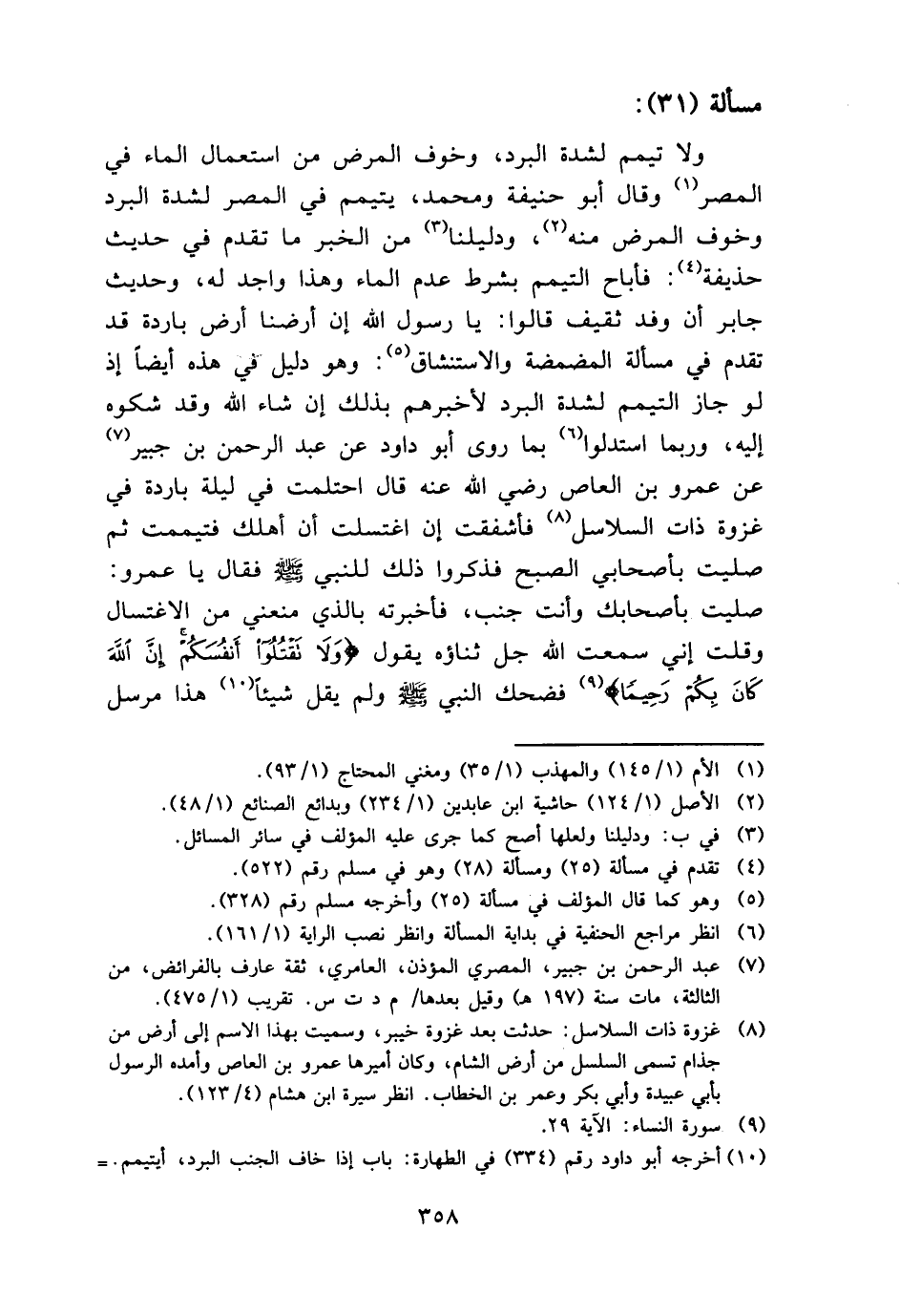 وَلَا تيَمّم لشدَّة الْبرد، وَخَوف الْمَرَض من اسْتِعْمَال المَاء فِي الْمصر وَقَالَ أَبُو حنيفَة وَمُحَمّد، يتَيَمَّم فِي الْمصر لشدَّة الْبرد وَخَوف الْمَرَض مِنْهُ، وَدَلِيلنَا من الْخَبَر مَا تقدم فِي حَدِيث حُذَيْفَة: فأباح التَّيَمُّم بِشَرْط عدم المَاء وَهَذَا وَاجِد لَهُ، وَحَدِيث جَابر أَن وَفد ثَقِيف قَالُوا: يَا رَسُول الله إِن أَرْضنَا أَرض بَارِدَة قد تقدم فِي مَسْأَلَة الْمَضْمَضَة وَالِاسْتِنْشَاق: وَهُوَ دَلِيل فِي هَذِه أَيْضا إِذْ لَو جَازَ التَّيَمُّم لشدَّة الْبرد لأخبرهم بذلك إِن شَاءَ الله وَقد شكوه إِلَيْهِ، وَرُبمَا استدلوا بِمَا روى أَبُو دَاوُد عَن عبد الرَّحْمَن بن جُبَير عَن عَمْرو بن الْعَاصِ رَضِي الله عَنهُ قَالَ احْتَلَمت فِي لَيْلَة بَارِدَة فِي غَزْوَة ذَات السلَاسِل فَأَشْفَقت إِن اغْتَسَلت أَن أهلك فَتَيَمَّمت ثمَّ صليت بِأَصْحَابِي الصُّبْح فَذكرُوا ذَلِك للنَّبِي - صَلَّى اللَّهُ عَلَيْهِ وَسَلَّم َ - فَقَالَ يَا عَمْرو: صليت بِأَصْحَابِك وَأَنت جنب، فَأَخْبَرته بِالَّذِي مَنَعَنِي من الِاغْتِسَال وَقلت إِنِّي سَمِعت الله جلّ ثَنَاؤُهُ يَقُول {وَلَا تقتلُوا أَنفسكُم إِن الله كَانَ بكم رحِيما} فَضَحِك النَّبِي - صَلَّى اللَّهُ عَلَيْهِ وَسَلَّم َ - وَلم يقل شَيْئا هَذَا مُرْسل