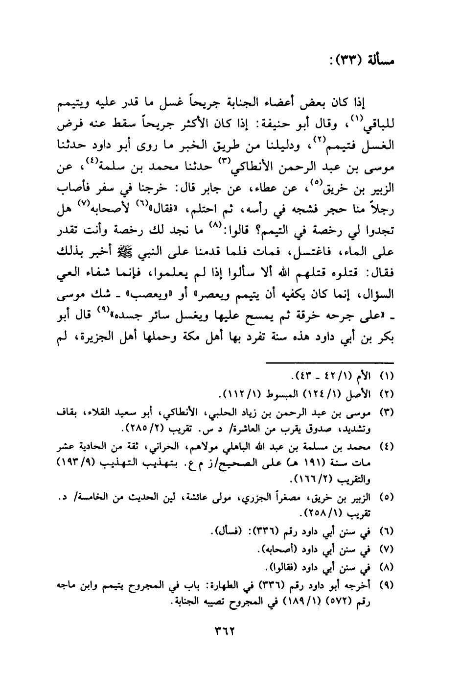 إِذا كَانَ بعض أَعْضَاء الْجَنَابَة جريحا غسل مَا قدر عَلَيْهِ وَيتَيَمَّم للْبَاقِي، وَقَالَ أَبُو حنيفَة: إِذا كَانَ الْأَكْثَر جريحا سقط عَنهُ فرض الْغسْل فَتَيَمم، وَدَلِيلنَا من طَرِيق الْخَبَر مَا روى أَبُو دَاوُد حَدثنَا مُوسَى بن عبد الرَّحْمَن الْأَنْطَاكِي حَدثنَا مُحَمَّد بن سَلمَة، عَن الزبير بن خريق، عَن عَطاء، عَن جَابر قَالَ: خرجنَا فِي سفر فَأصَاب رجلا منا حجر فَشَجَّهُ فِي رَأسه، ثمَّ احْتَلَمَ، " فَقَالَ " لأَصْحَابه هَل تَجدوا لي رخصَة فِي التَّيَمُّم؟ قَالُوا: مَا نجد لَك رخصَة وَأَنت تقدر على المَاء، فاغتسل، فَمَاتَ فَلَمَّا قدمنَا على النَّبِي - صَلَّى اللَّهُ عَلَيْهِ وَسَلَّم َ - أخبر بذلك فَقَالَ: قَتَلُوهُ قَتلهمْ الله أَلا سَأَلُوا إِذا لم يعلمُوا، فَإِنَّمَا شِفَاء العي السُّؤَال، إِنَّمَا كَانَ يَكْفِيهِ أَن يتَيَمَّم ويعصر " أَو " ويعصب " - شكّ مُوسَى - " على جرحه خرقَة ثمَّ يمسح عَلَيْهَا وَيغسل سَائِر جسده " قَالَ أَبُو بكر بن أبي دَاوُد هَذِه سنة تفرد بهَا أهل مَكَّة وَحملهَا أهل الجزيرة، لم