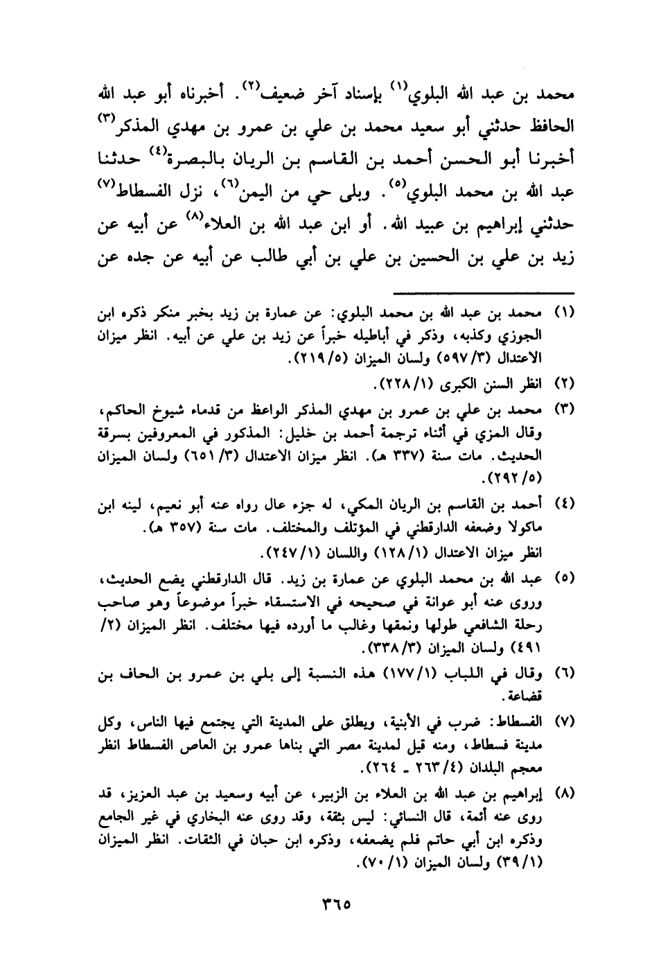 مُحَمَّد بن عبد الله البلوي بِإِسْنَاد آخر ضَعِيف. أخبرناه أَبُو عبد الله الْحَافِظ حَدثنِي أَبُو سعيد مُحَمَّد بن عَليّ بن عَمْرو بن مهْدي الْمُذكر أخبرنَا أَبُو الْحسن أَحْمد بن الْقَاسِم بن الريان بِالْبَصْرَةِ حَدثنَا عبد الله بن مُحَمَّد البلوي. وبلى حَيّ من الْيمن، نزل الْفسْطَاط حَدثنِي إِبْرَاهِيم بن عبيد الله. أَو ابْن عبد الله بن الْعَلَاء عَن أَبِيه عَن زيد بن عَليّ بن الْحُسَيْن بن عَليّ بن أبي طَالب عَن أَبِيه عَن جده عَن