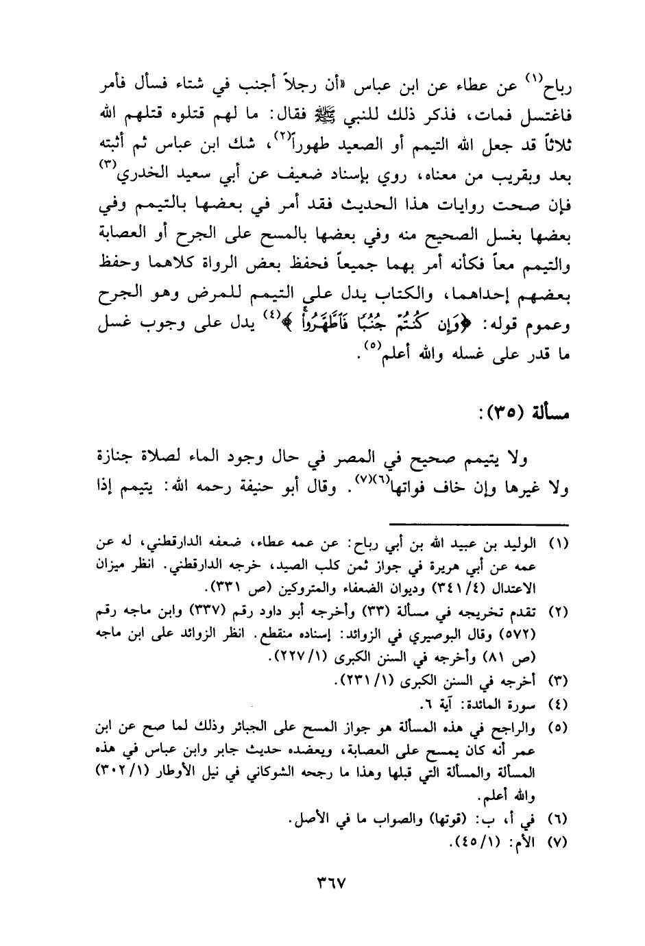 رَبَاح عَن عَطاء عَن ابْن عَبَّاس " أَن رجلا أجنب فِي شتاء فَسَأَلَ فَأمر فاغتسل فَمَاتَ، فَذكر ذَلِك للنَّبِي - صَلَّى اللَّهُ عَلَيْهِ وَسَلَّم َ - فَقَالَ: مَا لَهُم قَتَلُوهُ قَتلهمْ الله ثَلَاثًا قد جعل الله التَّيَمُّم أَو الصَّعِيد طهُورا، شكّ ابْن عَبَّاس ثمَّ أثْبته بعد وبقريب من مَعْنَاهُ، رُوِيَ بِإِسْنَاد ضَعِيف عَن أبي سعيد الْخُدْرِيّ فَإِن صحت رِوَايَات هَذَا الحَدِيث فقد أَمر فِي بَعْضهَا بِالتَّيَمُّمِ وَفِي بَعْضهَا بِغسْل الصَّحِيح مِنْهُ وَفِي بَعْضهَا بِالْمَسْحِ على الْجرْح أَو الْعِصَابَة وَالتَّيَمُّم مَعًا فَكَأَنَّهُ أَمر بهما جَمِيعًا فحفظ بعض الروَاة كِلَاهُمَا وَحفظ بَعضهم إِحْدَاهمَا، وَالْكتاب يدل على التَّيَمُّم للمرض وَهُوَ الْجرْح وَعُمُوم قَوْله: {وَإِن كُنْتُم جنبا فاطهروا} يدل على وجوب غسل مَا قدر على غسله وَالله أعلم.