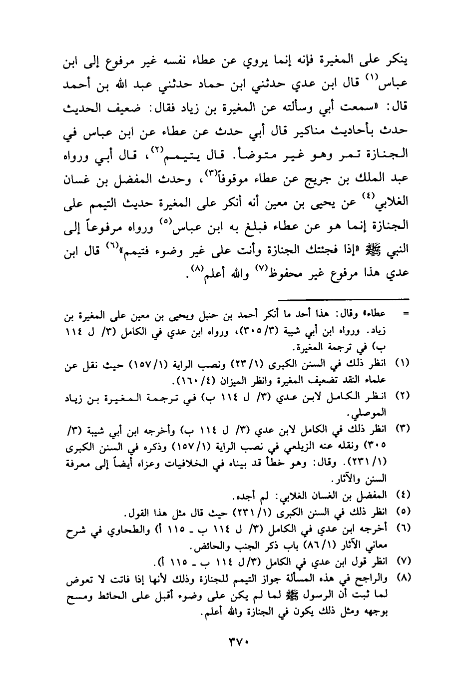 يُنكر على الْمُغيرَة فَإِنَّهُ إِنَّمَا يروي عَن عَطاء نَفسه غير مَرْفُوع إِلَى ابْن عَبَّاس قَالَ ابْن عدي حَدثنِي ابْن حَمَّاد حَدثنِي عبد الله بن أَحْمد قَالَ: " سَمِعت أبي وَسَأَلته عَن الْمُغيرَة بن زِيَاد فَقَالَ: ضَعِيف الحَدِيث حدث بِأَحَادِيث مَنَاكِير قَالَ أبي حدث عَن عَطاء عَن ابْن عَبَّاس فِي الْجِنَازَة تمر وَهُوَ غير متوضأ. قَالَ يتَيَمَّم، قَالَ أبي وَرَوَاهُ عبد الْملك بن جريج عَن عَطاء مَوْقُوفا، وَحدث الْمفضل بن غَسَّان الْغلابِي عَن يحيى بن معِين أَنه أنكر على الْمُغيرَة حَدِيث التَّيَمُّم على الْجِنَازَة إِنَّمَا هُوَ عَن عَطاء فَبلغ بِهِ ابْن عَبَّاس وَرَوَاهُ مَرْفُوعا إِلَى النَّبِي - صَلَّى اللَّهُ عَلَيْهِ وَسَلَّم َ - " إِذا فجئتك الْجِنَازَة وَأَنت على غير وضوء فَتَيَمم " قَالَ ابْن عدي هَذَا مَرْفُوع غير مَحْفُوظ وَالله أعلم.