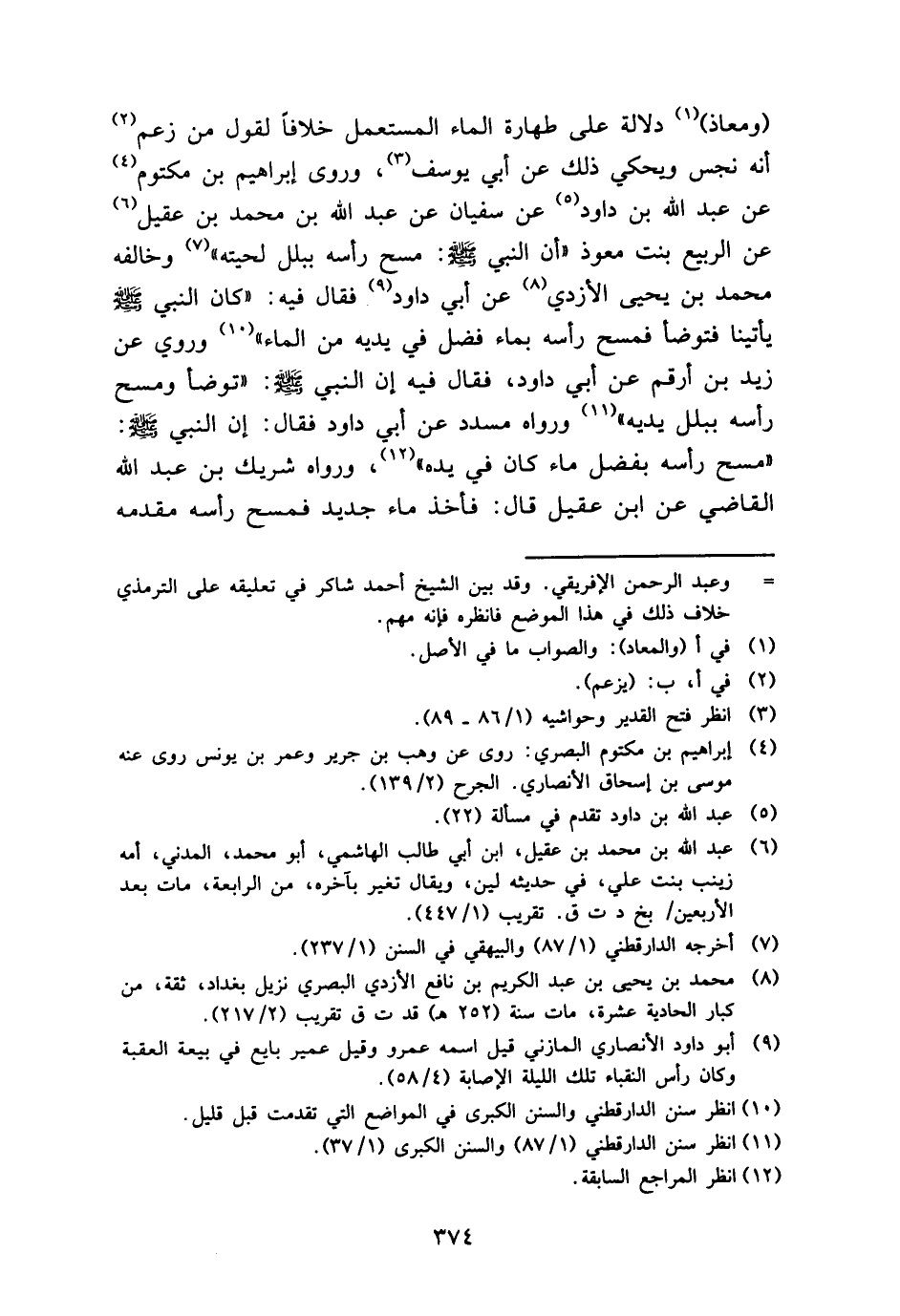 (ومعاذ) دلَالَة على طَهَارَة المَاء الْمُسْتَعْمل خلافًا لقَوْل من زعم أَنه نجس ويحكي ذَلِك عَن أبي يُوسُف، وروى إِبْرَاهِيم بن مَكْتُوم عَن عبد الله بن دَاوُد عَن سُفْيَان عَن عبد الله بن مُحَمَّد بن عقيل عَن الرّبيع بنت معوذ " أَن النَّبِي - صَلَّى اللَّهُ عَلَيْهِ وَسَلَّم َ -: مسح رَأسه ببلل لحيته " وَخَالفهُ مُحَمَّد بن يحيى الْأَزْدِيّ عَن أبي دَاوُد فَقَالَ فِيهِ: " كَانَ النَّبِي - صَلَّى اللَّهُ عَلَيْهِ وَسَلَّم َ - يأتينا فَتَوَضَّأ فَمسح رَأسه بِمَاء فضل فِي يَدَيْهِ من المَاء " وَرُوِيَ عَن زيد بن أَرقم عَن أبي دَاوُد، فَقَالَ فِيهِ إِن النَّبِي - صَلَّى اللَّهُ عَلَيْهِ وَسَلَّم َ -: " تَوَضَّأ وَمسح رَأسه ببلل يَدَيْهِ " وَرَوَاهُ مُسَدّد عَن أبي دَاوُد فَقَالَ: إِن النَّبِي - صَلَّى اللَّهُ عَلَيْهِ وَسَلَّم َ -: " مسح رَأسه بِفضل مَاء كَانَ فِي يَده "، وَرَوَاهُ شريك بن عبد الله القَاضِي عَن ابْن عقيل قَالَ: فَأخذ مَاء جَدِيد فَمسح رَأسه مقدمه