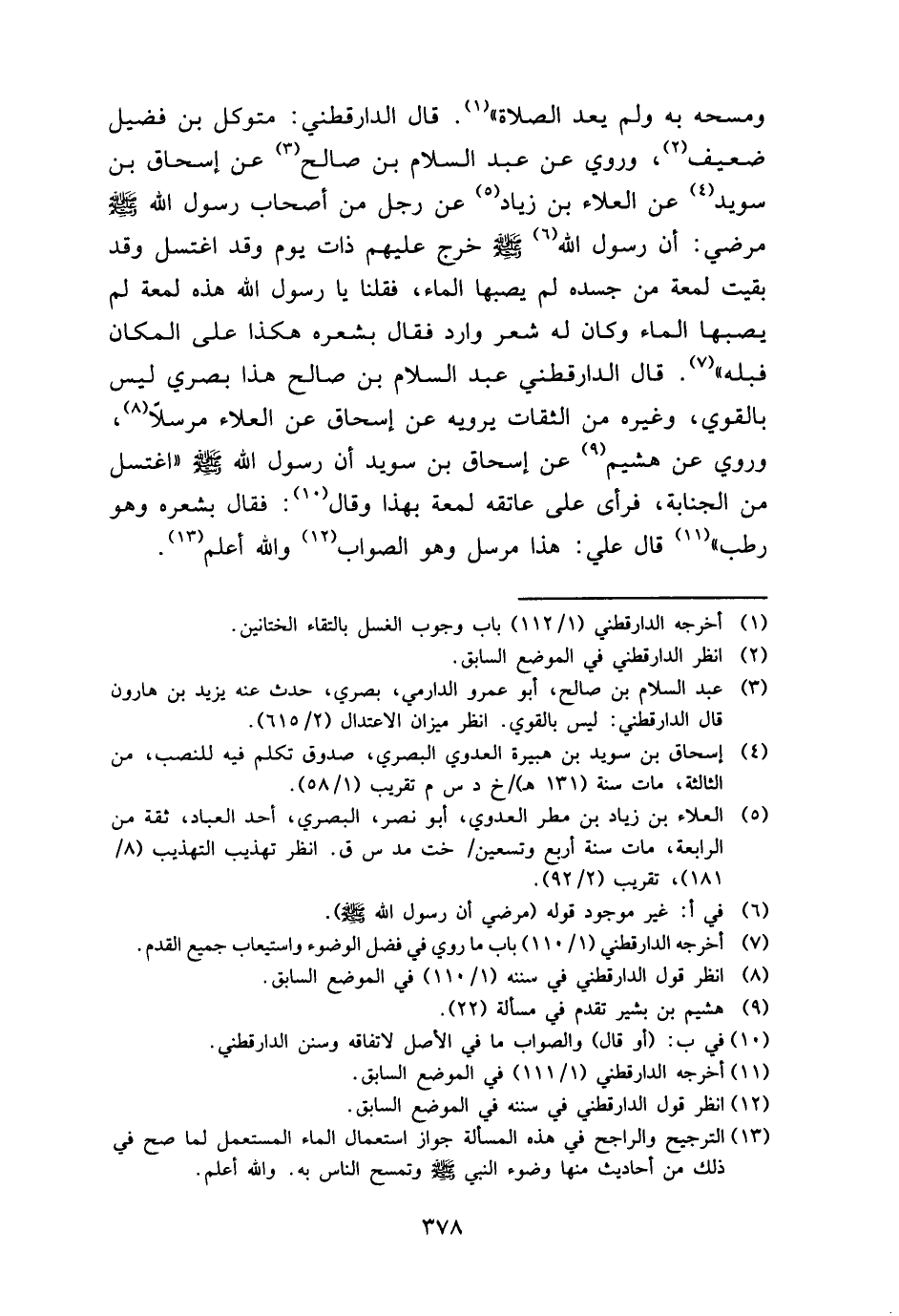 ومسحه بِهِ وَلم يعد الصَّلَاة ". قَالَ الدَّارَقُطْنِيّ: متوكل بن فُضَيْل ضَعِيف، وَرُوِيَ عَن عبد السَّلَام بن صَالح عَن إِسْحَاق بن سُوَيْد عَن الْعَلَاء بن زِيَاد عَن رجل من أَصْحَاب رَسُول الله - صَلَّى اللَّهُ عَلَيْهِ وَسَلَّم َ - مرضِي: أَن رَسُول الله - صَلَّى اللَّهُ عَلَيْهِ وَسَلَّم َ - خرج عَلَيْهِم ذَات يَوْم وَقد اغْتسل وَقد بقيت لمْعَة من جسده لم يصبهَا المَاء، فَقُلْنَا يَا رَسُول الله هَذِه لمْعَة لم يصبهَا المَاء وَكَانَ لَهُ شعر وَارِد فَقَالَ بِشعرِهِ هَكَذَا على الْمَكَان فبله ". قَالَ الدَّارَقُطْنِيّ عبد السَّلَام بن صَالح هَذَا بَصرِي لَيْسَ بِالْقَوِيّ، وَغَيره من الثِّقَات يرويهِ عَن إِسْحَاق عَن الْعَلَاء مُرْسلا، وَرُوِيَ عَن هشيم عَن إِسْحَاق بن سُوَيْد أَن رَسُول الله - صَلَّى اللَّهُ عَلَيْهِ وَسَلَّم َ - " اغْتسل من الْجَنَابَة، فَرَأى على عَاتِقه لمْعَة بِهَذَا وَقَالَ: فَقَالَ بِشعرِهِ وَهُوَ رطب " قَالَ عَليّ: هَذَا مُرْسل وَهُوَ الصَّوَاب وَالله أعلم.