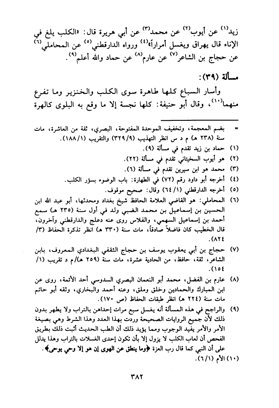 زيد عَن أَيُّوب عَن مُحَمَّد عَن أبي هُرَيْرَة قَالَ: " الْكَلْب يلغ فِي الْإِنَاء قَالَ يهراق وَيغسل أمرارا " وَرَوَاهُ الدَّارَقُطْنِيّ عَن الْمحَامِلِي عَن حجاج بن الشَّاعِر عَن عَارِم عَن حَمَّاد وَالله أعلم.