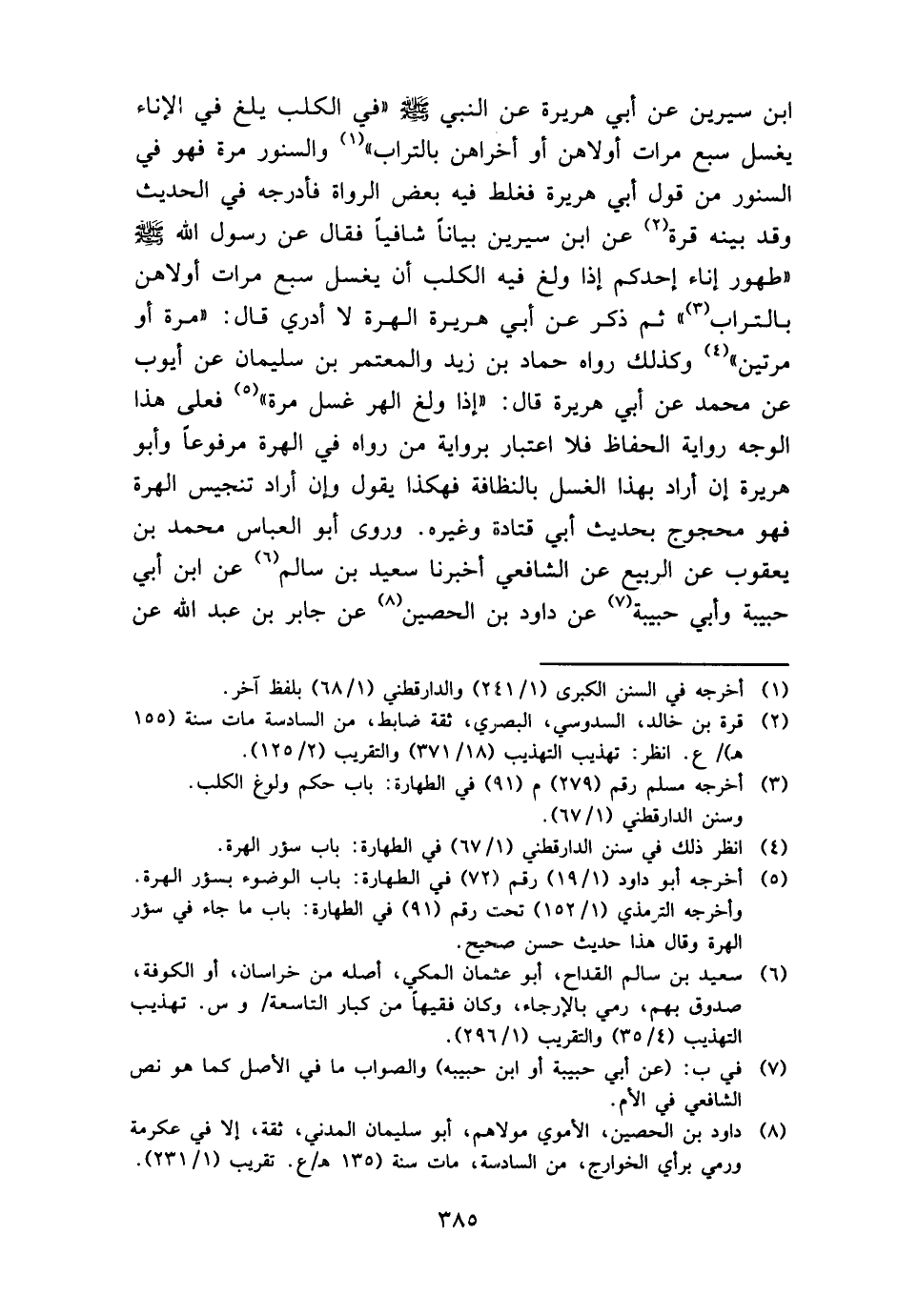 ابْن سِيرِين عَن أبي هُرَيْرَة عَن النَّبِي - صَلَّى اللَّهُ عَلَيْهِ وَسَلَّم َ - " فِي الْكَلْب يلغ فِي الْإِنَاء يغسل سبع مَرَّات أولَاهُنَّ أَو أخراهن بِالتُّرَابِ " والسنور مرّة فَهُوَ فِي السنور من قَول أبي هُرَيْرَة فغلط فِيهِ بعض الروَاة فأدرجه فِي الحَدِيث وَقد بَينه قُرَّة عَن ابْن سِيرِين بَيَانا شافيا فَقَالَ عَن رَسُول الله - صَلَّى اللَّهُ عَلَيْهِ وَسَلَّم َ - " طهُور إِنَاء أحدكُم إِذا ولغَ فِيهِ الْكَلْب أَن يغسل سبع مَرَّات أولَاهُنَّ بِالتُّرَابِ " ثمَّ ذكر عَن أبي هُرَيْرَة الْهِرَّة لَا أَدْرِي قَالَ: " مرّة أَو مرَّتَيْنِ " وَكَذَلِكَ رَوَاهُ حَمَّاد بن زيد والمعتمر بن سُلَيْمَان عَن أَيُّوب عَن مُحَمَّد عَن أبي هُرَيْرَة قَالَ: " إِذا ولغَ الهر غسل مرّة " فعلى هَذَا الْوَجْه رِوَايَة الْحفاظ فَلَا اعْتِبَار بِرِوَايَة من رَوَاهُ فِي الْهِرَّة مَرْفُوعا وَأَبُو هُرَيْرَة إِن أَرَادَ بِهَذَا الْغسْل بالنظافة فَهَكَذَا يَقُول وَإِن أَرَادَ تنجيس الْهِرَّة فَهُوَ محجوج بِحَدِيث أبي قَتَادَة وَغَيره. وروى أَبُو الْعَبَّاس مُحَمَّد بن يَعْقُوب عَن الرّبيع عَن الشَّافِعِي أخبرنَا سعيد بن سَالم عَن ابْن أبي حَبِيبَة وَأبي حَبِيبَة عَن دَاوُد بن الْحصين عَن جَابر بن عبد الله عَن