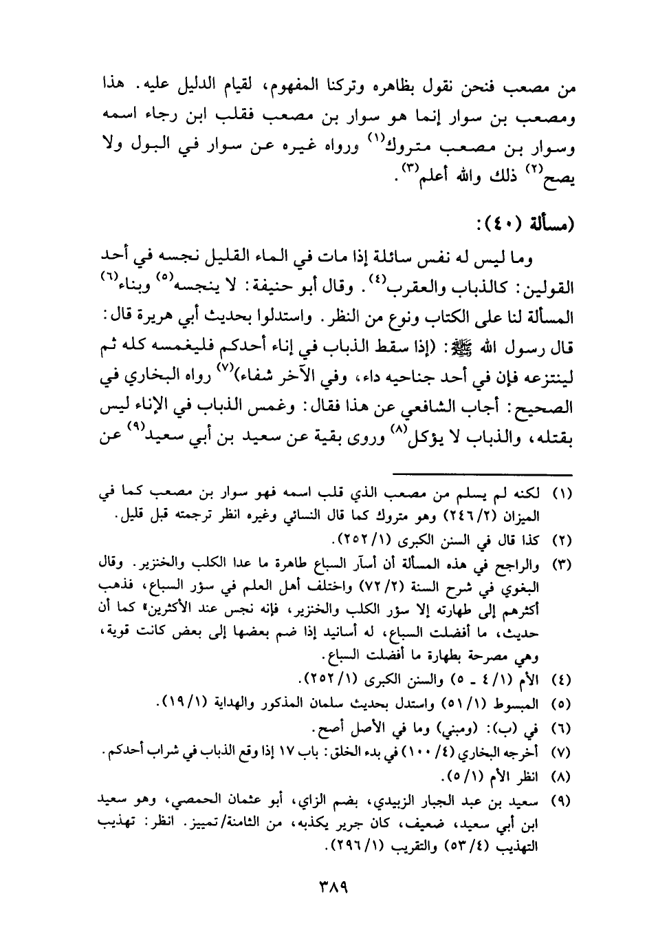 وَمَا لَيْسَ لَهُ نفس سَائِلَة إِذا مَاتَ فِي المَاء الْقَلِيل نجسه فِي أحد الْقَوْلَيْنِ: كالذباب وَالْعَقْرَب. وَقَالَ أَبُو حنيفَة: لَا يُنجسهُ وَبِنَاء الْمَسْأَلَة لنا على الْكتاب وَنَوع من النّظر. وَاسْتَدَلُّوا بِحَدِيث أبي هُرَيْرَة قَالَ: قَالَ رَسُول الله - صَلَّى اللَّهُ عَلَيْهِ وَسَلَّم َ -: (إِذا سقط الذُّبَاب فِي إِنَاء أحدكُم فليغمسه كُله ثمَّ لينتزعه فَإِن فِي أحد جناحيه دَاء، وَفِي الآخر شِفَاء) رَوَاهُ البُخَارِيّ فِي الصَّحِيح: أجَاب الشَّافِعِي عَن هَذَا فَقَالَ: وغمس الذُّبَاب فِي الْإِنَاء لَيْسَ بقتْله، والذباب لَا يُؤْكَل وروى بَقِيَّة عَن سعيد بن أبي سعيد عَن