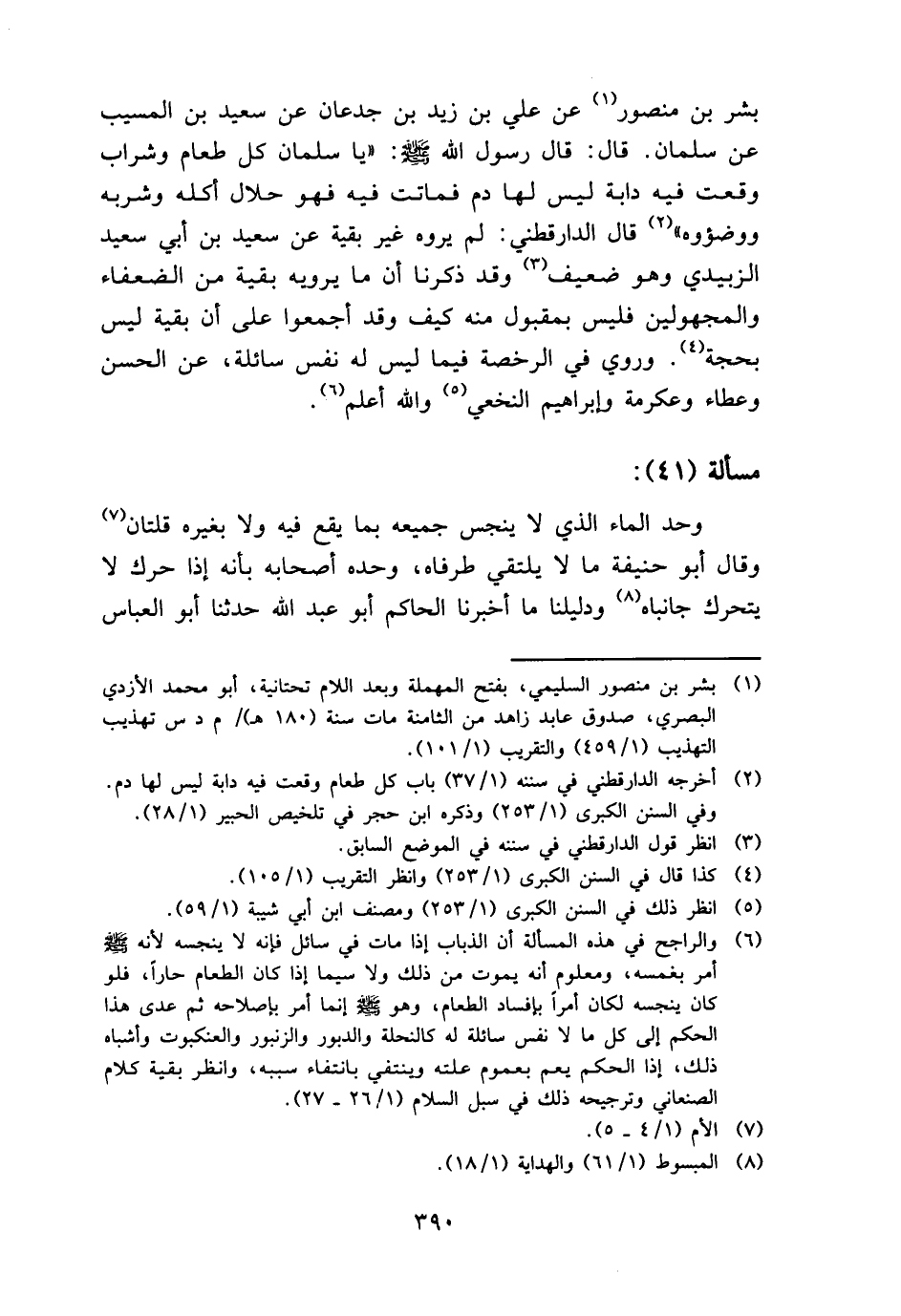 بشر بن مَنْصُور عَن عَليّ بن زيد بن جدعَان عَن سعيد بن الْمسيب عَن سلمَان. قَالَ: قَالَ رَسُول الله - صَلَّى اللَّهُ عَلَيْهِ وَسَلَّم َ -: " يَا سلمَان كل طَعَام وشراب وَقعت فِيهِ دَابَّة لَيْسَ لَهَا دم فَمَاتَتْ فِيهِ فَهُوَ حَلَال أكله وشربه ووضؤوه " قَالَ الدَّارَقُطْنِيّ: لم يروه غير بَقِيَّة عَن سعيد بن أبي سعيد الزبيدِيّ وَهُوَ ضَعِيف وَقد ذكرنَا أَن مَا يرويهِ بَقِيَّة من الضُّعَفَاء والمجهولين فَلَيْسَ بمقبول مِنْهُ كَيفَ وَقد أَجمعُوا على أَن بَقِيَّة لَيْسَ بِحجَّة. وَرُوِيَ فِي الرُّخْصَة فِيمَا لَيْسَ لَهُ نفس سَائِلَة، عَن الْحسن وَعَطَاء وَعِكْرِمَة وَإِبْرَاهِيم النَّخعِيّ وَالله أعلم.