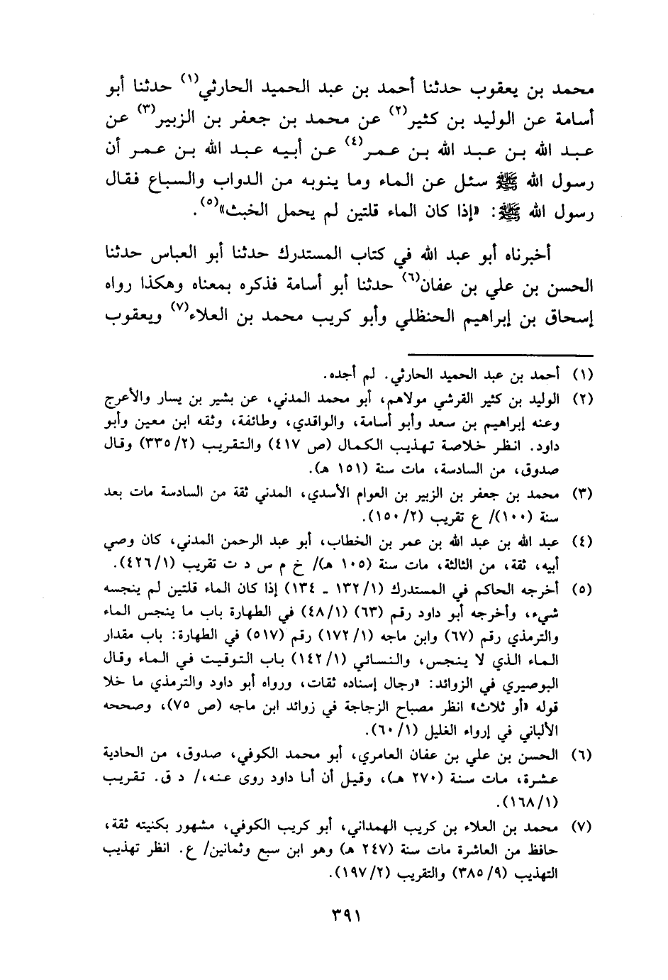 مُحَمَّد بن يَعْقُوب حَدثنَا أَحْمد بن عبد الحميد الْحَارِثِيّ حَدثنَا أَبُو أُسَامَة عَن الْوَلِيد بن كثير عَن مُحَمَّد بن جَعْفَر بن الزبير عَن عبد الله بن عبد الله بن عمر عَن أَبِيه عبد الله بن عمر أَن رَسُول الله - صَلَّى اللَّهُ عَلَيْهِ وَسَلَّم َ - سُئِلَ عَن المَاء وَمَا ينوبه من الدَّوَابّ وَالسِّبَاع فَقَالَ رَسُول الله - صَلَّى اللَّهُ عَلَيْهِ وَسَلَّم َ -: " إِذا كَانَ المَاء قُلَّتَيْنِ لم يحمل الْخبث ".