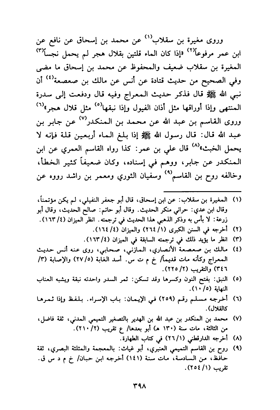 وروى مُغيرَة بن سقلاب عَن مُحَمَّد بن إِسْحَاق عَن نَافِع عَن ابْن عمر مَرْفُوعا " إِذا كَانَ المَاء قُلَّتَيْنِ بقلال هجر لم يحمل نجسا الْمُغيرَة بن سقلاب ضَعِيف وَالْمَحْفُوظ عَن مُحَمَّد بن إِسْحَاق مَا مضى وَفِي الصَّحِيح من حَدِيث قَتَادَة عَن أنس عَن مَالك بن صعصعة أَن نَبِي الله - صَلَّى اللَّهُ عَلَيْهِ وَسَلَّم َ - قَالَ فَذكر حَدِيث الْمِعْرَاج وَفِيه قَالَ وَدفعت إِلَى سِدْرَة الْمُنْتَهى وَإِذا أوراقها مثل أَذَان الفيول وَإِذا نبقها مثل قلال هجر " وروى الْقَاسِم بن عبد الله عَن مُحَمَّد بن الْمُنْكَدر عَن جَابر بن عبد الله قَالَ: قَالَ رَسُول الله - صَلَّى اللَّهُ عَلَيْهِ وَسَلَّم َ - إِذا بلغ المَاء أَرْبَعِينَ قلَّة فَإِنَّهُ لَا يحمل الْخبث " قَالَ عَليّ بن عمر: كَذَا رَوَاهُ الْقَاسِم الْعمريّ عَن ابْن الْمُنْكَدر عَن جَابر، وَوهم فِي إِسْنَاده، وَكَانَ ضَعِيفا كثير الْخَطَأ، وَخَالفهُ روح بن الْقَاسِم وسُفْيَان الثَّوْريّ وَمعمر بن رَاشد رَوَوْهُ عَن