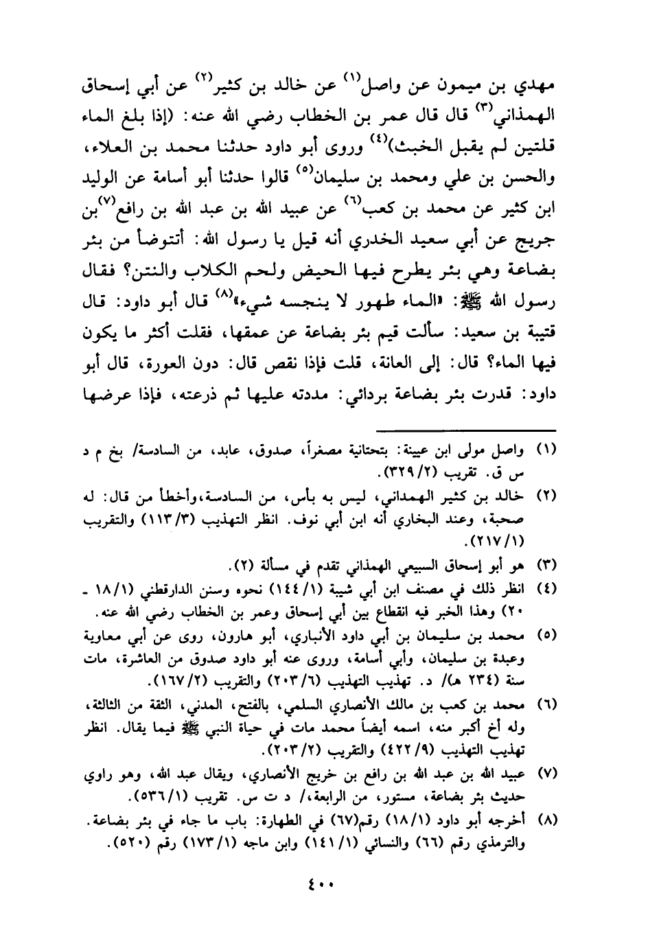 مهْدي بن مَيْمُون عَن وَاصل عَن خَالِد بن كثير عَن أبي إِسْحَاق الهمذاني قَالَ قَالَ عمر بن الْخطاب رَضِي الله عَنهُ: (إِذا بلغ المَاء قُلَّتَيْنِ لم يقبل الْخبث) وروى أَبُو دَاوُد حَدثنَا مُحَمَّد بن الْعَلَاء، وَالْحسن بن عَليّ وَمُحَمّد بن سُلَيْمَان قَالُوا حَدثنَا أَبُو أُسَامَة عَن الْوَلِيد ابْن كثير عَن مُحَمَّد بن كَعْب عَن عبيد الله بن عبد الله بن رَافع بن جريج عَن أبي سعيد الْخُدْرِيّ أَنه قيل يَا رَسُول الله: أتتوضأ من بِئْر بضَاعَة وَهِي بِئْر يطْرَح فِيهَا الْحيض وَلحم الْكلاب وَالنَّتن؟ فَقَالَ رَسُول الله - صَلَّى اللَّهُ عَلَيْهِ وَسَلَّم َ -: " المَاء طهُور لَا يُنجسهُ شَيْء " قَالَ أَبُو دَاوُد: قَالَ قُتَيْبَة بن سعيد: سَأَلت قيم بِئْر بضَاعَة عَن عمقها، فَقلت أَكثر مَا يكون فِيهَا المَاء؟ قَالَ: إِلَى الْعَانَة، قلت فَإِذا نقص قَالَ: دون الْعَوْرَة، قَالَ أَبُو دَاوُد: قدرت بِئْر بضَاعَة بردائي: مددته عَلَيْهَا ثمَّ ذرعته، فَإِذا عرضهَا