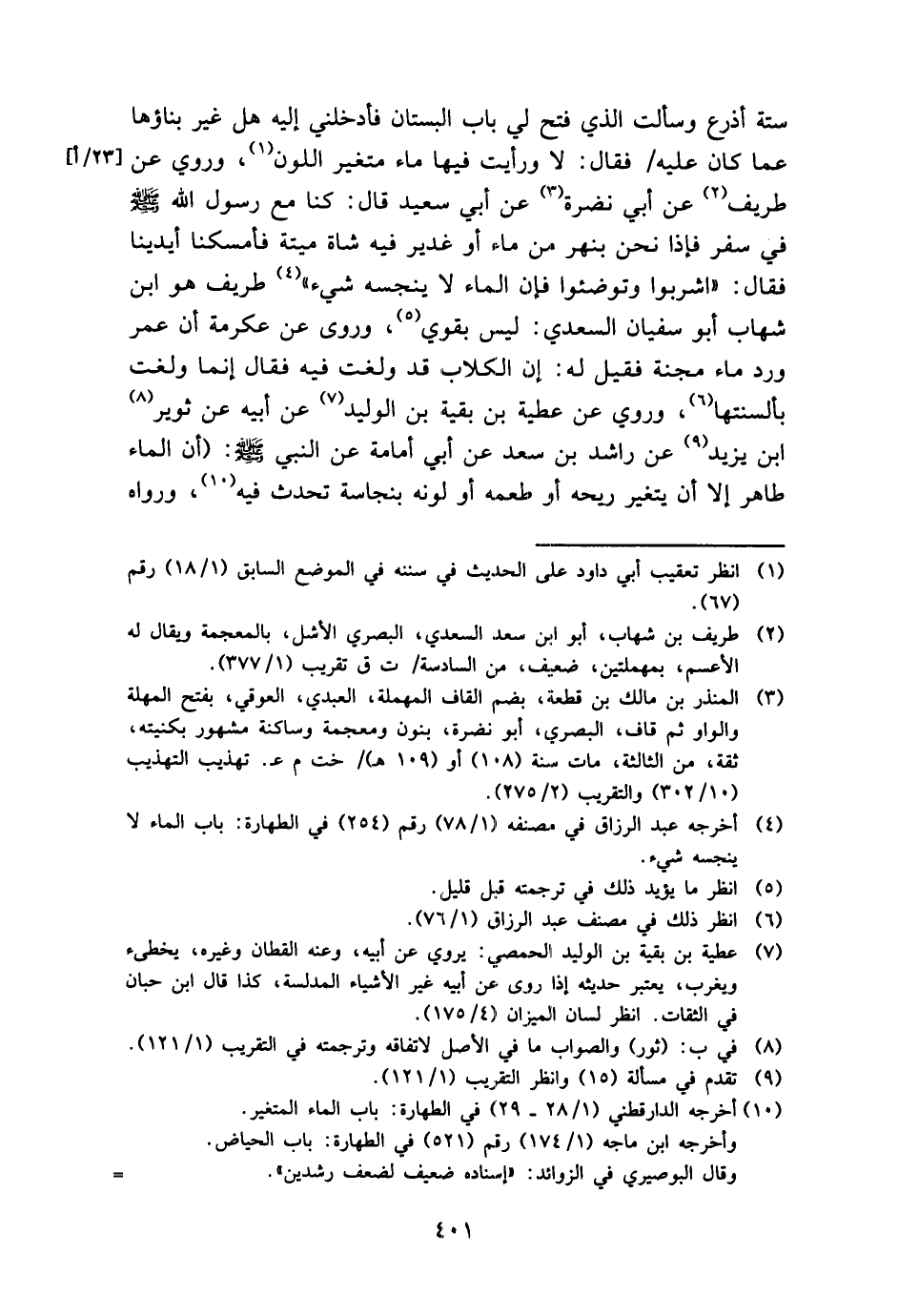 سِتَّة أَذْرع وَسَأَلت الَّذِي فتح لي بَاب الْبُسْتَان فَأَدْخلنِي إِلَيْهِ هَل غير بناؤها عَمَّا كَانَ عَلَيْهِ فَقَالَ: لَا وَرَأَيْت فِيهَا مَاء متغير اللَّوْن، وَرُوِيَ عَن طريف عَن أبي نَضرة عَن أبي سعيد قَالَ: كُنَّا مَعَ رَسُول لله - صَلَّى اللَّهُ عَلَيْهِ وَسَلَّم َ - فِي سفر فَإِذا نَحن بنهر من مَاء أَو غَدِير فِيهِ شَاة ميتَة فأمسكنا أَيْدِينَا فَقَالَ: " اشربوا وَتَوَضَّئُوا فَإِن المَاء لَا يُنجسهُ شَيْء " طريف هُوَ ابْن شهَاب أَبُو سُفْيَان السَّعْدِيّ: لَيْسَ بِقَوي، وروى عَن عِكْرِمَة أَن عمر ورد مَاء مجنة فَقيل لَهُ: إِن الْكلاب قد ولغت فِيهِ فَقَالَ إِنَّمَا ولغت بألسنتها، وَرُوِيَ عَن عَطِيَّة بن بَقِيَّة بن الْوَلِيد عَن أَبِيه عَن ثُوَيْر ابْن يزِيد عَن رَاشد بن سعد عَن أبي أُمَامَة عَن النَّبِي - صَلَّى اللَّهُ عَلَيْهِ وَسَلَّم َ -: (أَن المَاء طَاهِر إِلَّا أَن يتَغَيَّر رِيحه أَو طعمه أَو لَونه بِنَجَاسَة تحدث فِيهِ، وَرَوَاهُ