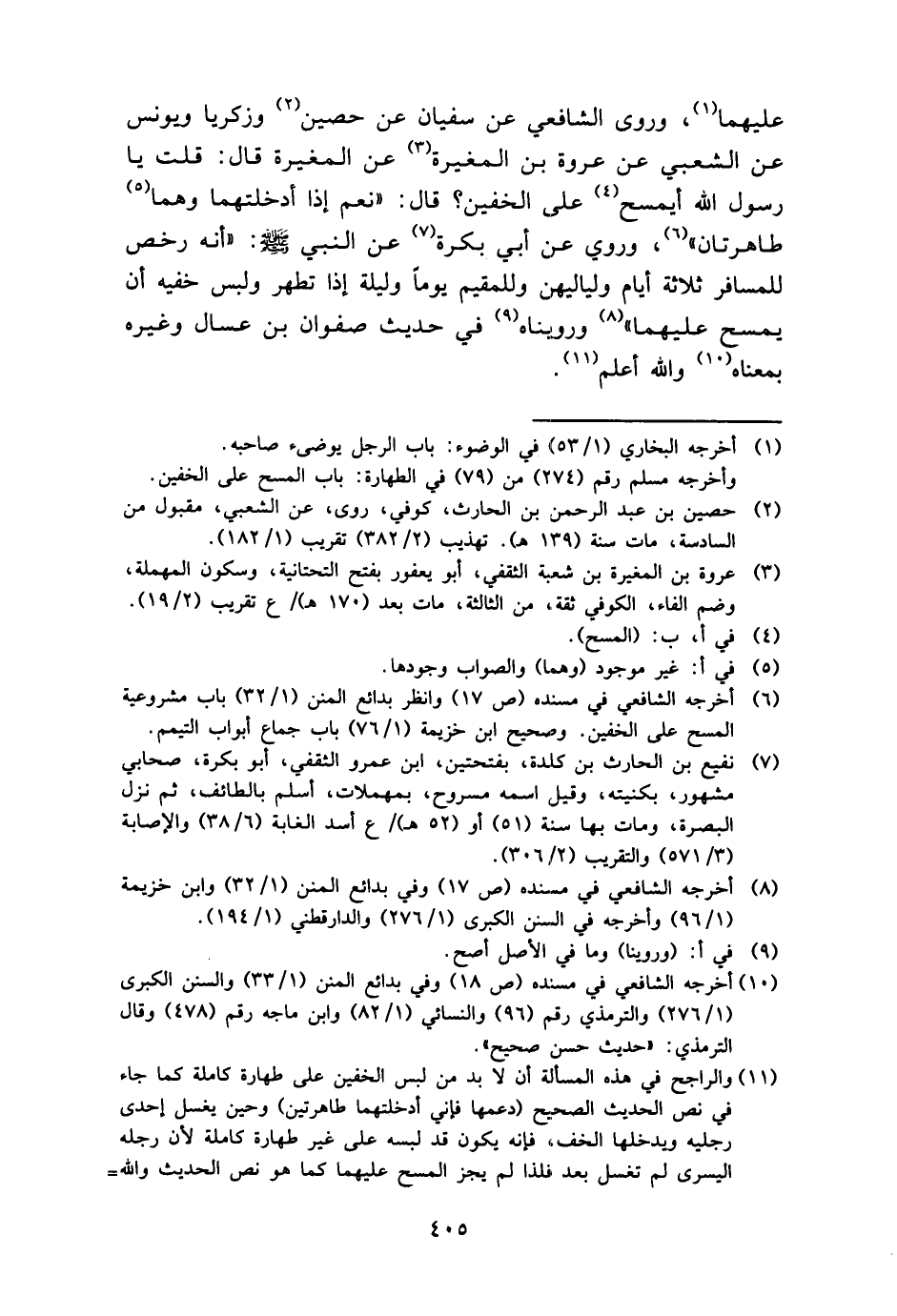 عَلَيْهِمَا، وروى الشَّافِعِي عَن سُفْيَان عَن حُصَيْن وزَكَرِيا وَيُونُس عَن الشّعبِيّ عَن عُرْوَة بن الْمُغيرَة عَن الْمُغيرَة قَالَ: قلت يَا رَسُول الله أيمسح على الْخُفَّيْنِ؟ قَالَ: " نعم إِذا أدخلتهما وهما طاهرتان "، وَرُوِيَ عَن أبي بكرَة عَن النَّبِي - صَلَّى اللَّهُ عَلَيْهِ وَسَلَّم َ -: " أَنه رخص للْمُسَافِر ثَلَاثَة أَيَّام ولياليهن وللمقيم يَوْمًا وَلَيْلَة إِذا تطهر وَلبس خفيه أَن يمسح عَلَيْهِمَا " ورويناه فِي حَدِيث صَفْوَان بن عَسَّال وَغَيره بِمَعْنَاهُ وَالله أعلم.