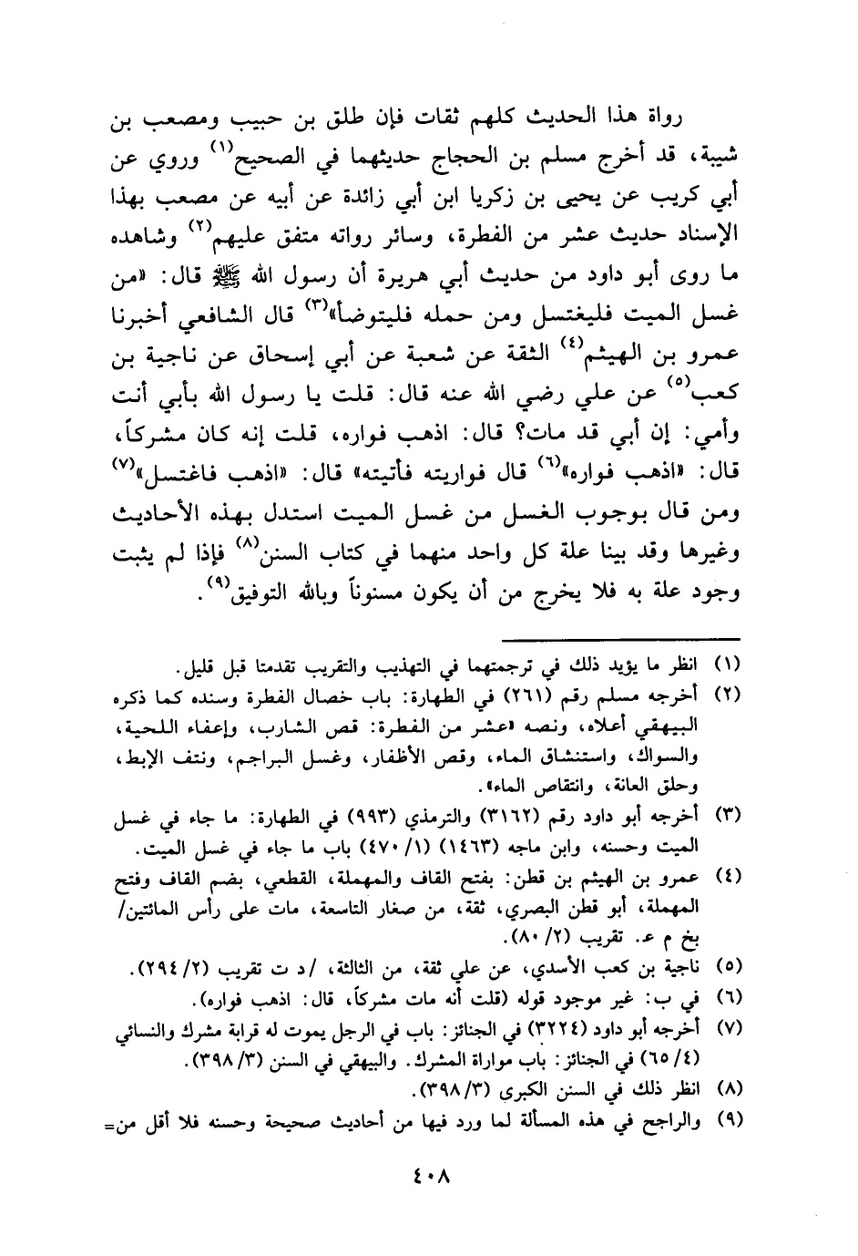 رُوَاة هَذَا الحَدِيث كلهم ثِقَات فَإِن طلق بن حبيب وَمصْعَب بن شيبَة، قد أخرج مُسلم بن الْحجَّاج حَدِيثهمَا فِي الصَّحِيح وَرُوِيَ عَن أبي كريب عَن يحيى بن زَكَرِيَّا ابْن أبي زَائِدَة عَن أَبِيه عَن مُصعب بِهَذَا الْإِسْنَاد حَدِيث عشر من الْفطْرَة، وَسَائِر رُوَاته مُتَّفق عَلَيْهِم وَشَاهده مَا روى أَبُو دَاوُد من حَدِيث أبي هُرَيْرَة أَن رَسُول الله - صَلَّى اللَّهُ عَلَيْهِ وَسَلَّم َ - قَالَ: " من غسل الْمَيِّت فليغتسل وَمن حمله فَليَتَوَضَّأ " قَالَ الشَّافِعِي أخبرنَا عَمْرو بن الْهَيْثَم الثِّقَة عَن شُعْبَة عَن أبي إِسْحَاق عَن نَاجِية بن كَعْب عَن عَليّ رَضِي الله عَنهُ قَالَ: قلت يَا رَسُول الله بِأبي أَنْت وَأمي: إِن أبي قد مَاتَ؟ قَالَ: اذْهَبْ فواره، قلت إِنَّه كَانَ مُشْركًا، قَالَ: " اذْهَبْ فواره " قَالَ فواريته فَأَتَيْته " قَالَ: " اذْهَبْ فاغتسل " وَمن قَالَ بِوُجُوب الْغسْل من غسل الْمَيِّت اسْتدلَّ بِهَذِهِ الْأَحَادِيث وَغَيرهَا وَقد بَينا عِلّة كل وَاحِد مِنْهُمَا فِي كتاب السّنَن فَإِذا لم يثبت وجود عِلّة بِهِ فَلَا يخرج من أَن يكون مسنونا وَبِاللَّهِ التَّوْفِيق.