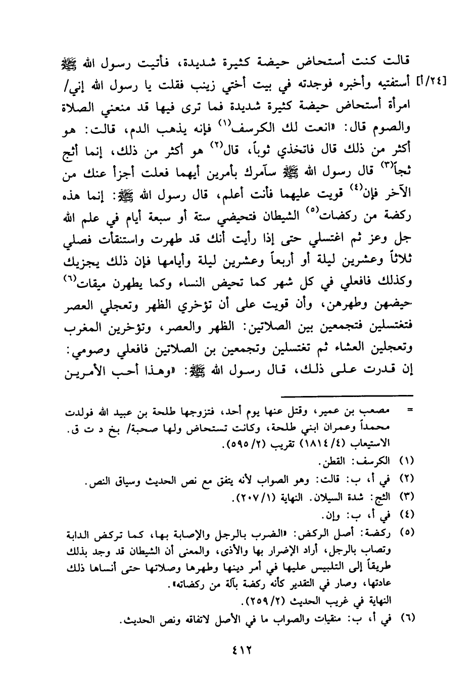 قَالَت كنت أسْتَحَاض حَيْضَة كَثِيرَة شَدِيدَة، فَأتيت رَسُول الله - صَلَّى اللَّهُ عَلَيْهِ وَسَلَّم َ - أستفتيه وَأخْبرهُ فَوَجَدته فِي بَيت أُخْتِي زَيْنَب فَقلت يَا رَسُول الله إِنِّي امْرَأَة أسْتَحَاض حَيْضَة كَثِيرَة شَدِيدَة فَمَا ترى فِيهَا قد مَنَعَنِي الصَّلَاة وَالصَّوْم قَالَ: " انعت لَك الكرسف فَإِنَّهُ يذهب الدَّم، قَالَت: هُوَ أَكثر من ذَلِك قَالَ فاتخذي ثوبا، قَالَ هُوَ أَكثر من ذَلِك، إِنَّمَا أثج ثَجًّا قَالَ رَسُول الله - صَلَّى اللَّهُ عَلَيْهِ وَسَلَّم َ - سآمرك بأمرين أَيهمَا فعلت أَجْزَأَ عَنْك من الآخر فَإِن قويت عَلَيْهِمَا فَأَنت أعلم، قَالَ رَسُول الله - صَلَّى اللَّهُ عَلَيْهِ وَسَلَّم َ -: إِنَّمَا هَذِه ركضة من ركضات الشَّيْطَان فتحيضي سِتَّة أَو سَبْعَة أَيَّام فِي علم الله جلّ وَعز ثمَّ اغْتَسِلِي حَتَّى إِذا رَأَيْت أَنَّك قد طهرت واستنقأت فَصلي ثَلَاثًا وَعشْرين لَيْلَة أَو أَرْبعا وَعشْرين لَيْلَة وأيامها فَإِن ذَلِك يجْزِيك وَكَذَلِكَ فافعلي فِي كل شهر كَمَا تحيض النِّسَاء وكما يطهرن مِيقَات حيضهن وطهرهن، وَإِن قويت على أَن تؤخري الظّهْر وتعجلي الْعَصْر فتغتسلين فتجمعين بَين الصَّلَاتَيْنِ: الظّهْر وَالْعصر، وتؤخرين الْمغرب وتعجلين الْعشَاء ثمَّ تغتسلين وتجمعين بَين الصَّلَاتَيْنِ فافعلي وصومي: إِن قدرت على ذَلِك، قَالَ رَسُول الله - صَلَّى اللَّهُ عَلَيْهِ وَسَلَّم َ -: " وَهَذَا أحب الْأَمريْنِ