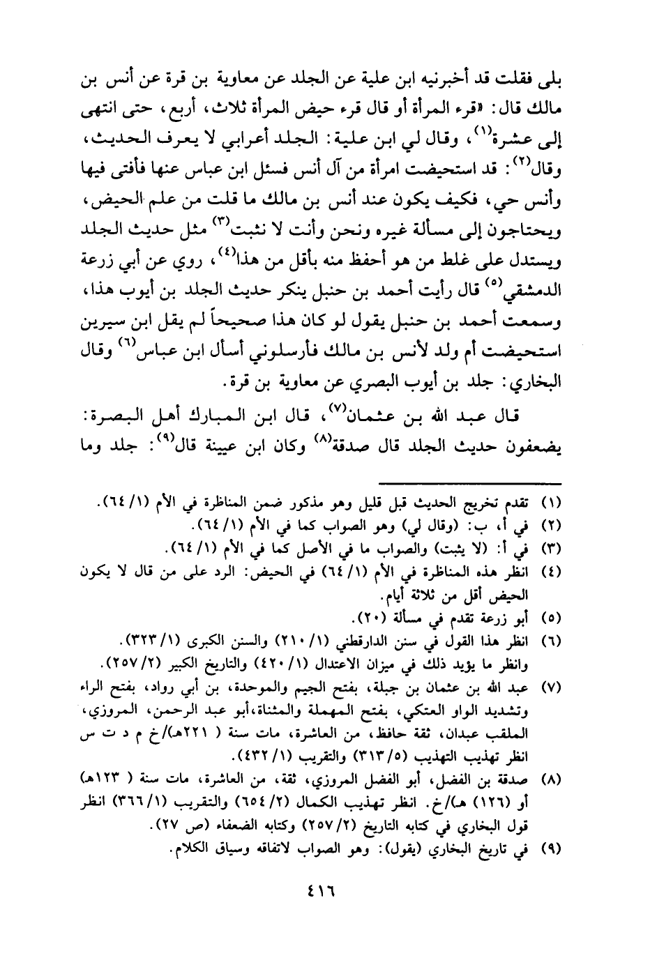 بلَى فَقلت قد أخبرنيه ابْن علية عَن الْجلد عَن مُعَاوِيَة بن قُرَّة عَن أنس بن مَالك قَالَ: " قرء الْمَرْأَة أَو قَالَ قرء حيض الْمَرْأَة ثَلَاث، أَربع، حَتَّى انْتهى إِلَى عشرَة، وَقَالَ لي ابْن علية: الْجلد أَعْرَابِي لَا يعرف الحَدِيث، وَقَالَ: قد استحيضت امْرَأَة من آل أنس فَسئلَ ابْن عَبَّاس عَنْهَا فَأفْتى فِيهَا وَأنس حَيّ، فَكيف يكون عِنْد أنس بن مَالك مَا قلت من علم الْحيض، ويحتاجون إِلَى مَسْأَلَة غَيره وَنحن وَأَنت لَا نثبت مثل حَدِيث الْجلد ويستدل على غلط من هُوَ أحفظ مِنْهُ بِأَقَلّ من هَذَا، رُوِيَ عَن أبي زرْعَة الدِّمَشْقِي قَالَ رَأَيْت أَحْمد بن حَنْبَل يُنكر حَدِيث الْجلد بن أَيُّوب هَذَا، وَسمعت أَحْمد بن حَنْبَل يَقُول لَو كَانَ هَذَا صَحِيحا لم يقل ابْن سِيرِين استحيضت أم ولد لأنس بن مَالك فأرسلوني أسأَل ابْن عَبَّاس وَقَالَ البُخَارِيّ: جلد بن أَيُّوب الْبَصْرِيّ عَن مُعَاوِيَة بن قُرَّة.