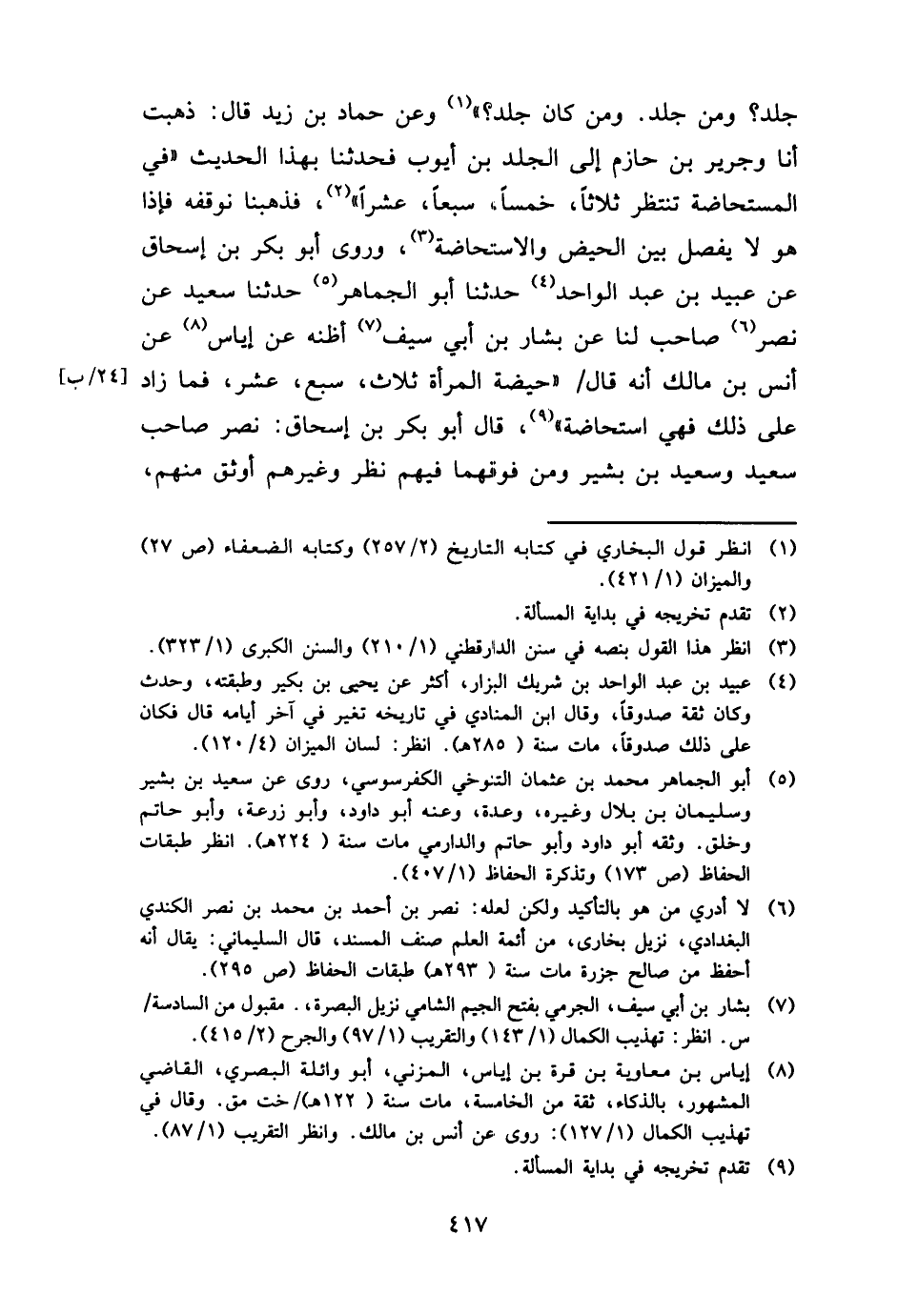 جلد؟ وَمن جلد. وَمن كَانَ جلد؟ " وَعَن حَمَّاد بن زيد قَالَ: ذهبت أَنا وَجَرِير بن حَازِم إِلَى الْجلد بن أَيُّوب فحدثنا بِهَذَا الحَدِيث " فِي الْمُسْتَحَاضَة تنْتَظر ثَلَاثًا، خمْسا، سبعا، عشرا " فذهبنا نوقفه فَإِذا هُوَ لَا يفصل بَين الْحيض والاستحاضة، وروى أَبُو بكر بن إِسْحَاق عَن عبيد بن عبد الْوَاحِد حَدثنَا أَبُو الْجمَاهِر حَدثنَا سعيد عَن نصر صَاحب لنا عَن بشار بن أبي سيف أَظُنهُ عَن إِيَاس عَن أنس بن مَالك أَنه قَالَ " حَيْضَة الْمَرْأَة ثَلَاث، سبع، عشر، فَمَا زَاد على ذَلِك فَهِيَ اسْتِحَاضَة "، قَالَ أَبُو بكر بن إِسْحَاق: نصر صَاحب سعيد وَسَعِيد بن بشير وَمن فَوْقهمَا فيهم نظر وَغَيرهم أوثق مِنْهُم،