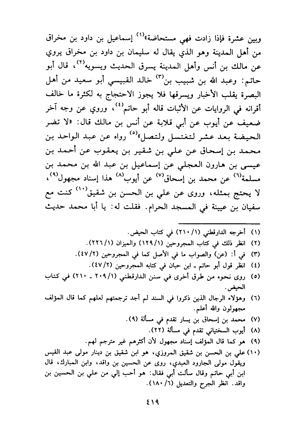 وَبَين عشرَة فَإِذا زَادَت فَهِيَ مُسْتَحَاضَة " إِسْمَاعِيل بن دَاوُد بن مِخْرَاق من أهل الْمَدِينَة وَهُوَ الَّذِي يُقَال لَهُ سُلَيْمَان بن دَاوُد بن مِخْرَاق يروي عَن مَالك بن أنس وَأهل الْمَدِينَة يسرق الحَدِيث ويسويه، قَالَ أَبُو حَاتِم: وَعبد الله بن شبيب بن خَالِد القبيسي أَبُو سعيد من أهل الْبَصْرَة يقلب الْأَخْبَار ويسرقها فَلَا يجوز الِاحْتِجَاج بِهِ لِكَثْرَة مَا خَالف أقرانه فِي الرِّوَايَات عَن الْأَثْبَات قَالَه أَبُو حَاتِم، وَرُوِيَ عَن وَجه آخر ضَعِيف عَن أَيُّوب عَن أبي قلَابَة عَن أنس بن مَالك قَالَ: " لَا تضر الْحَيْضَة بعد عشر لتغتسل ولتصل " رَوَاهُ عَن عبد الْوَاحِد بن مُحَمَّد بن إِسْحَاق عَن عَليّ بن شقير بن يَعْقُوب عَن أَحْمد بن عِيسَى بن هَارُون الْعجلِيّ عَن إِسْمَاعِيل بن عبد الله بن مُحَمَّد بن مسلمة عَن مُحَمَّد بن إِسْحَاق عَن أَيُّوب هَذَا إِسْنَاد مَجْهُول، لَا يحْتَج بِمثلِهِ، وروى عَن عَليّ بن الْحسن بن شَقِيق كنت مَعَ سُفْيَان بن عُيَيْنَة فِي الْمَسْجِد الْحَرَام. فَقلت لَهُ: يَا أَبَا مُحَمَّد حَدِيث