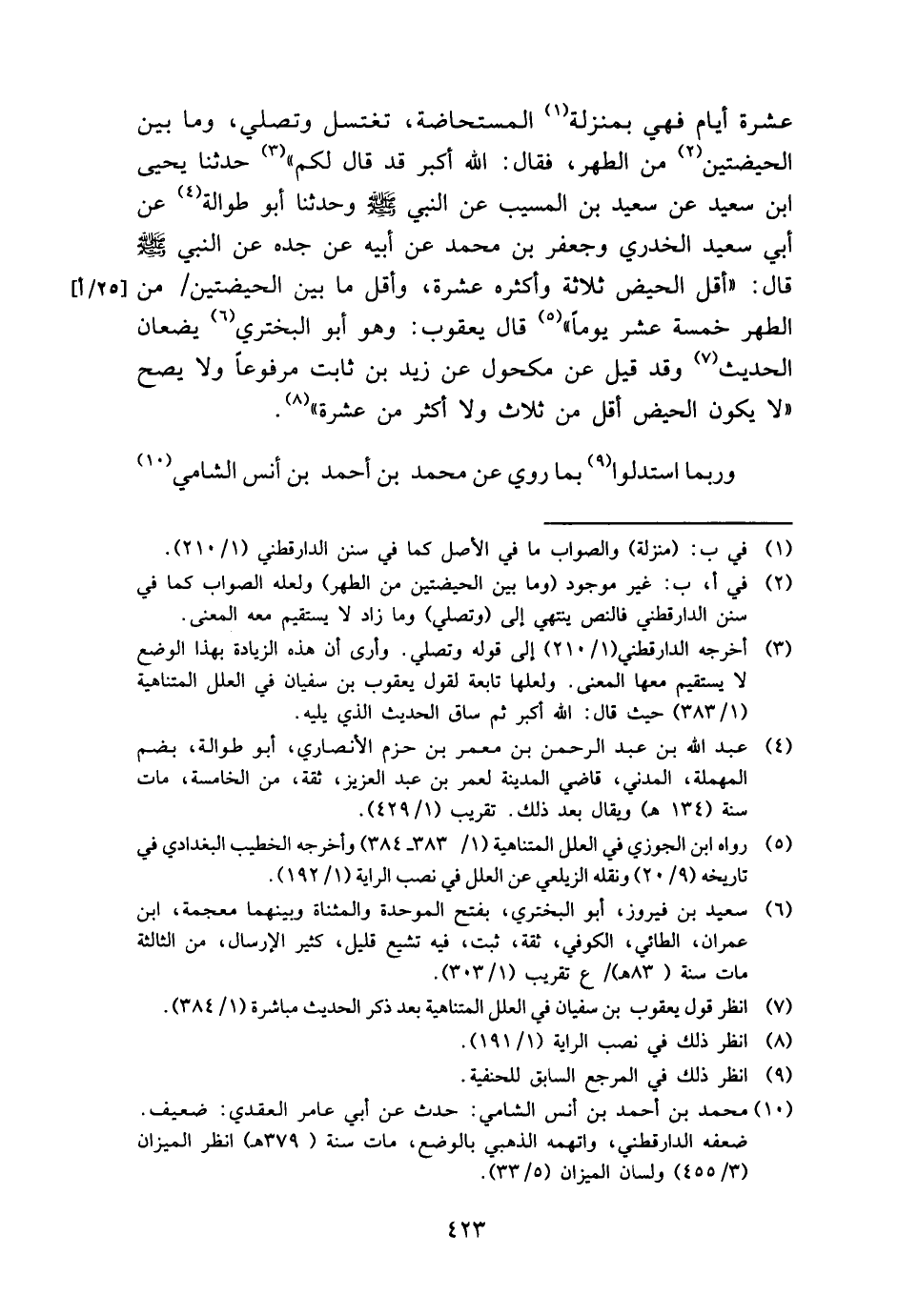 عشرَة أَيَّام فَهِيَ بِمَنْزِلَة الْمُسْتَحَاضَة، تَغْتَسِل وَتصلي، وَمَا بَين الحيضتين من الطُّهْر، فَقَالَ: الله أكبر قد قَالَ لكم " حَدثنَا يحيى ابْن سعيد عَن سعيد بن الْمسيب عَن النَّبِي - صَلَّى اللَّهُ عَلَيْهِ وَسَلَّم َ - وَحدثنَا أَبُو طوالة عَن أبي سعيد الْخُدْرِيّ وجعفر بن مُحَمَّد عَن أَبِيه عَن جده عَن النَّبِي - صَلَّى اللَّهُ عَلَيْهِ وَسَلَّم َ - قَالَ: " أقل الْحيض ثَلَاثَة وَأَكْثَره عشرَة، وَأَقل مَا بَين الحيضتين من الطُّهْر خَمْسَة عشر يَوْمًا " قَالَ يَعْقُوب: وَهُوَ أَبُو البخْترِي يضعان الحَدِيث وَقد قيل عَن مَكْحُول عَن زيد بن ثَابت مَرْفُوعا وَلَا يَصح " لَا يكون الْحيض أقل من ثَلَاث وَلَا أَكثر من عشرَة ".