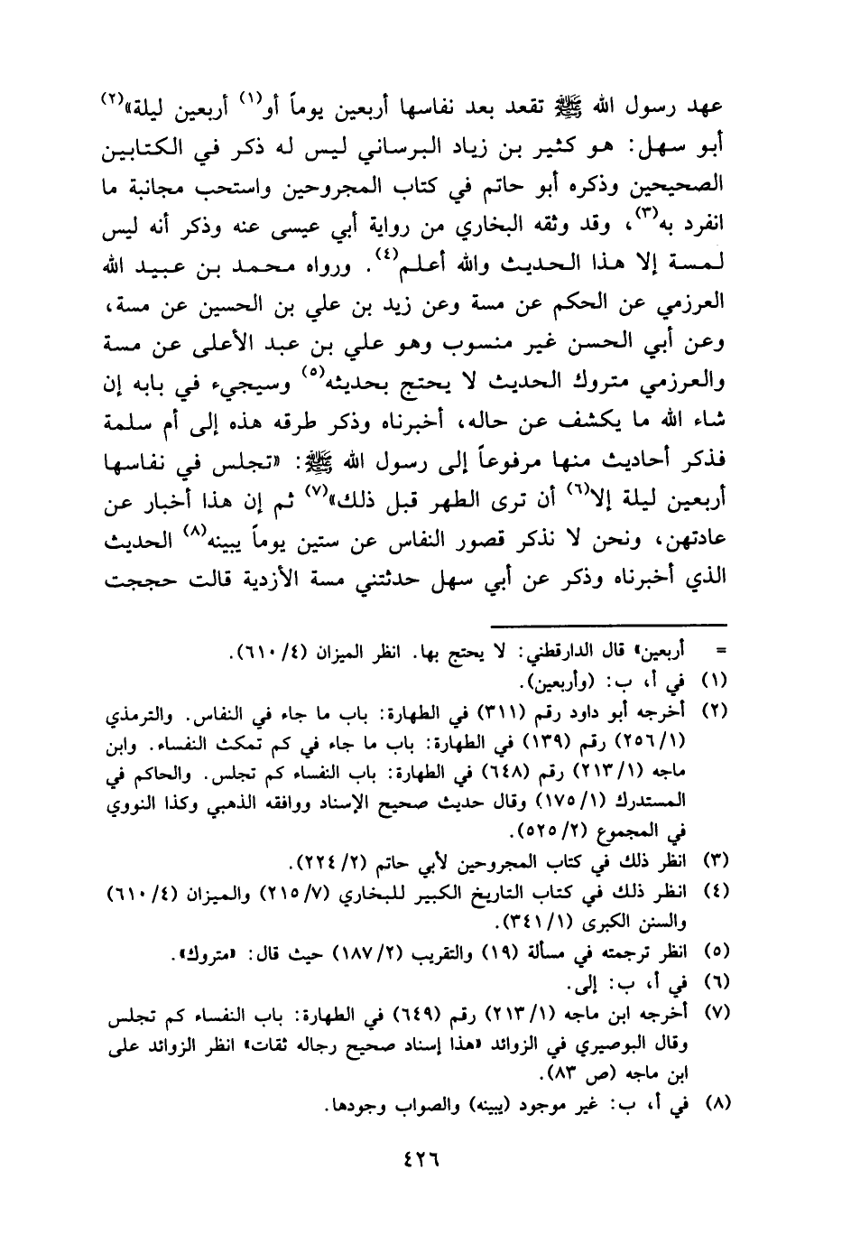 عهد رَسُول الله - صَلَّى اللَّهُ عَلَيْهِ وَسَلَّم َ - تقعد بعد نفَاسهَا أَرْبَعِينَ يَوْمًا أَو أَرْبَعِينَ لَيْلَة " أَبُو سهل: هُوَ كثير بن زِيَاد البرْسَانِي لَيْسَ لَهُ ذكر فِي الْكِتَابَيْنِ الصَّحِيحَيْنِ وَذكره أَبُو حَاتِم فِي كتاب الْمَجْرُوحين وَاسْتحبَّ مجانبة مَا انْفَرد بِهِ، وَقد وَثَّقَهُ البُخَارِيّ من رِوَايَة أبي عِيسَى عَنهُ وَذكر أَنه لَيْسَ لمسة إِلَّا هَذَا الحَدِيث وَالله أعلم. وَرَوَاهُ مُحَمَّد بن عبيد الله الْعَرْزَمِي عَن الحكم عَن مسَّة وَعَن زيد بن عَليّ بن الْحُسَيْن عَن مسَّة، وَعَن أبي الْحسن غير مَنْسُوب وَهُوَ عَليّ بن عبد الْأَعْلَى عَن مسَّة والعرزمي مَتْرُوك الحَدِيث لَا يحْتَج بحَديثه وَسَيَجِيءُ فِي بَابه إِن شَاءَ الله مَا يكْشف عَن حَاله، أخبرناه وَذكر طرقه هَذِه إِلَى أم سَلمَة فَذكر أَحَادِيث مِنْهَا مَرْفُوعا إِلَى رَسُول الله - صَلَّى اللَّهُ عَلَيْهِ وَسَلَّم َ -: " تجْلِس فِي نفَاسهَا أَرْبَعِينَ لَيْلَة إِلَّا أَن ترى الطُّهْر قبل ذَلِك " ثمَّ إِن هَذَا أَخْبَار عَن عادتهن، وَنحن لَا نذْكر قُصُور النّفاس عَن سِتِّينَ يَوْمًا يُبينهُ الحَدِيث الَّذِي أخبرناه وَذكر عَن أبي سهل حَدَّثتنِي مسَّة الْأَزْدِيَّة قَالَت حججْت
