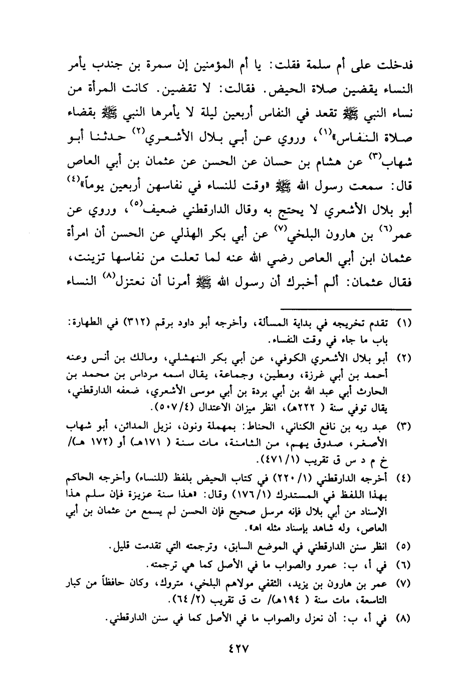 فَدخلت على أم سَلمَة فَقلت: يَا أم الْمُؤمنِينَ إِن سَمُرَة بن جُنْدُب يَأْمر النِّسَاء يقضين صَلَاة الْحيض. فَقَالَت: لَا تقضين. كَانَت الْمَرْأَة من نسَاء النَّبِي - صَلَّى اللَّهُ عَلَيْهِ وَسَلَّم َ - تقعد فِي النّفاس أَرْبَعِينَ لَيْلَة لَا يأمرها النَّبِي - صَلَّى اللَّهُ عَلَيْهِ وَسَلَّم َ - بِقَضَاء صَلَاة النّفاس "، وَرُوِيَ عَن أبي بِلَال الْأَشْعَرِيّ حَدثنَا أَبُو شهَاب عَن هِشَام بن حسان عَن الْحسن عَن عُثْمَان بن أبي الْعَاصِ قَالَ: سَمِعت رَسُول الله - صَلَّى اللَّهُ عَلَيْهِ وَسَلَّم َ - " وَقت للنِّسَاء فِي نفاسهن أَرْبَعِينَ يَوْمًا " أَبُو بِلَال الْأَشْعَرِيّ لَا يحْتَج بِهِ وَقَالَ الدَّارَقُطْنِيّ ضَعِيف، وَرُوِيَ عَن عمر بن هَارُون الْبَلْخِي عَن أبي بكر الْهُذلِيّ عَن الْحسن أَن امْرَأَة عُثْمَان ابْن أبي الْعَاصِ رَضِي الله عَنهُ لما تعلت من نفَاسهَا تزينت، فَقَالَ عُثْمَان: ألم أخْبرك أَن رَسُول الله - صَلَّى اللَّهُ عَلَيْهِ وَسَلَّم َ - أمرنَا أَن نَعْتَزِل النِّسَاء