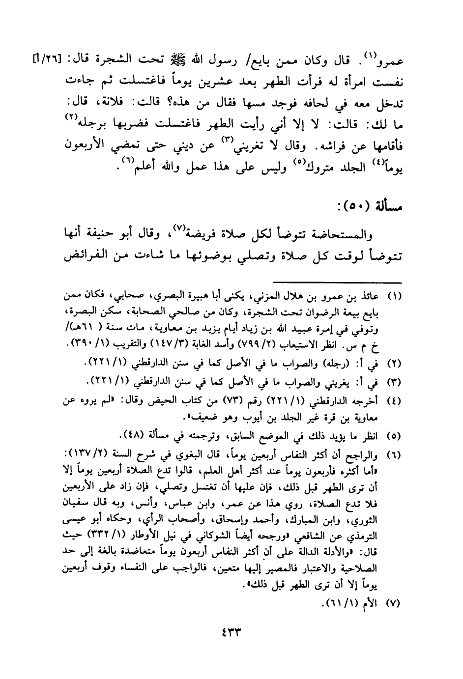 عَمْرو. قَالَ وَكَانَ مِمَّن بَايع رَسُول الله - صَلَّى اللَّهُ عَلَيْهِ وَسَلَّم َ - تَحت الشَّجَرَة قَالَ: نفست امْرَأَة لَهُ فرأت الطُّهْر بعد عشْرين يَوْمًا فاغتسلت ثمَّ جَاءَت تدخل مَعَه فِي لِحَافه فَوجدَ مَسهَا فَقَالَ من هَذِه؟ قَالَت: فُلَانَة، قَالَ: مَا لَك: قَالَت: لَا إِلَّا أَنِّي رَأَيْت الطُّهْر فاغتسلت فضربها بِرجلِهِ فأقامها عَن فرَاشه. وَقَالَ لَا تغريني عَن ديني حَتَّى تمْضِي الْأَرْبَعُونَ يَوْمًا الْجلد مَتْرُوك وَلَيْسَ على هَذَا عمل وَالله أعلم.