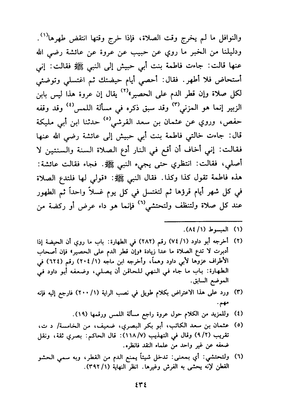 والنوافل مَا لم يخرج وَقت الصَّلَاة، فَإِذا خرج وَقتهَا انْتقض طهرهَا. وَدَلِيلنَا من الْخَبَر مَا رُوِيَ عَن حبيب عَن عُرْوَة عَن عَائِشَة رَضِي الله عَنْهَا قَالَت: جَاءَت فَاطِمَة بنت أبي حُبَيْش إِلَى النَّبِي - صَلَّى اللَّهُ عَلَيْهِ وَسَلَّم َ - فَقَالَت: إِنِّي أسْتَحَاض فَلَا أطهر. فَقَالَ: أحصي أَيَّام حيضتك ثمَّ اغْتَسِلِي وتوضئي لكل صَلَاة وَإِن قطر الدَّم على الْحَصِير " يُقَال إِن عُرْوَة هَذَا لَيْسَ بِابْن الزبير إِنَّمَا هُوَ الْمُزنِيّ وَقد سبق ذكره فِي مَسْأَلَة اللَّمْس وَقد وَقفه حَفْص، وَرُوِيَ عَن عُثْمَان بن سعد الْقرشِي حَدثنَا ابْن أبي مليكَة قَالَ: جَاءَت خَالَتِي فَاطِمَة بنت أبي حُبَيْش إِلَى عَائِشَة رَضِي الله عَنْهَا فَقَالَت: إِنِّي أَخَاف أَن أقع فِي النَّار أدع الصَّلَاة السّنة والسنتين لَا أُصَلِّي، فَقَالَت: انتظري حَتَّى يَجِيء النَّبِي - صَلَّى اللَّهُ عَلَيْهِ وَسَلَّم َ -. فجَاء فَقَالَت عَائِشَة: هَذِه فَاطِمَة تَقول كَذَا وَكَذَا. فَقَالَ النَّبِي - صَلَّى اللَّهُ عَلَيْهِ وَسَلَّم َ -: " قولي لَهَا فلتدع الصَّلَاة فِي كل شهر أَيَّام قرؤها ثمَّ لتغتسل فِي كل يَوْم غسلا وَاحِدًا ثمَّ الطّهُور عِنْد كل صَلَاة ولتنظف ولتحتشي فَإِنَّمَا هُوَ دَاء عرض أَو ركضة من