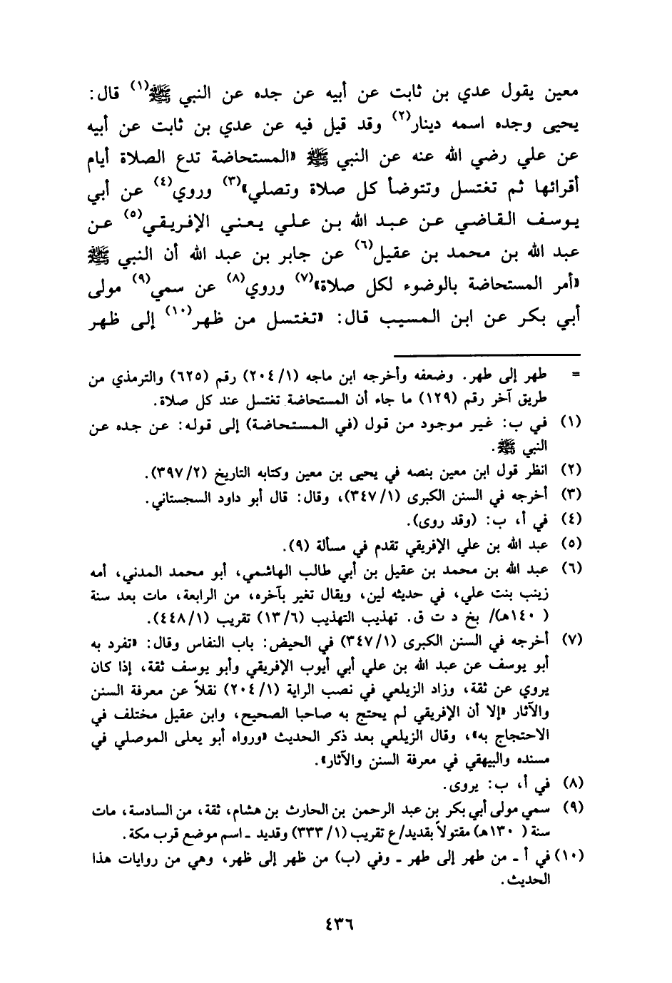 معِين يَقُول عدي بن ثَابت عَن أَبِيه عَن جده عَن النَّبِي - صَلَّى اللَّهُ عَلَيْهِ وَسَلَّم َ - قَالَ: يحيى وجده اسْمه دِينَار وَقد قيل فِيهِ عَن عدي بن ثَابت عَن أَبِيه عَن عَليّ رَضِي الله عَنهُ عَن النَّبِي - صَلَّى اللَّهُ عَلَيْهِ وَسَلَّم َ - " الْمُسْتَحَاضَة تدع الصَّلَاة أَيَّام أقرائها ثمَّ تَغْتَسِل وتتوضأ كل صَلَاة وَتصلي " وَرُوِيَ عَن أبي يُوسُف القَاضِي عَن عبد الله بن عَليّ يَعْنِي الإفْرِيقِي عَن عبد الله بن مُحَمَّد بن عقيل عَن جَابر بن عبد الله أَن النَّبِي - صَلَّى اللَّهُ عَلَيْهِ وَسَلَّم َ - " أَمر الْمُسْتَحَاضَة بِالْوضُوءِ لكل صَلَاة " وَرُوِيَ عَن سمي مولى أبي بكر عَن ابْن الْمسيب قَالَ: " تَغْتَسِل من ظهر إِلَى ظهر