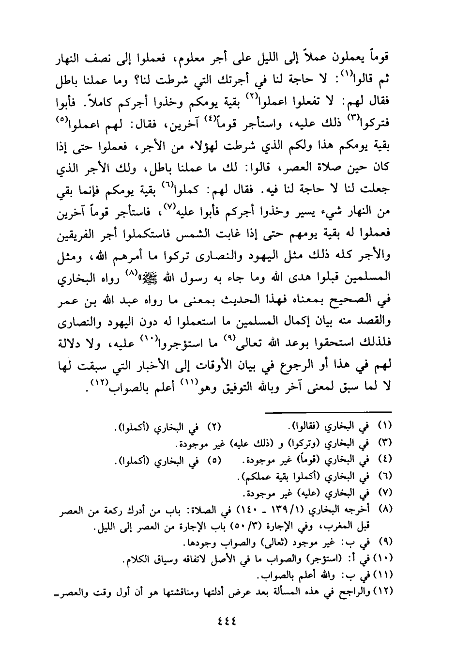 قوما يعْملُونَ عملا إِلَى اللَّيْل على أجر مَعْلُوم، فعملوا إِلَى نصف النَّهَار ثمَّ قَالُوا: لَا حَاجَة لنا فِي أجرتك الَّتِي شرطت لنا؟ وَمَا عَملنَا بَاطِل فَقَالَ لَهُم: لَا تَفعلُوا اعْمَلُوا بَقِيَّة يومكم وخذوا أجركُم كَامِلا. فَأَبَوا فتركوا ذَلِك عَلَيْهِ، واستأجر قوما آخَرين، فَقَالَ لَهُم اعْمَلُوا بَقِيَّة يومكم هَذَا وَلكم الَّذِي شرطت لهَؤُلَاء من الْأجر، فعملوا حَتَّى إِذا كَانَ حِين صَلَاة الْعَصْر، قَالُوا: لَك مَا عَملنَا بَاطِل، وَلَك الْأجر الَّذِي جعلت لنا لَا حَاجَة لنا فِيهِ. فَقَالَ لَهُم: كملوا بَقِيَّة يومكم فَإِنَّمَا بَقِي من النَّهَار شَيْء يسير وخذوا أجركُم فَأَبَوا عَلَيْهِ، فاستأجر قوما آخَرين فعملوا لَهُ بَقِيَّة يومهم حَتَّى إِذا غَابَتْ الشَّمْس فاستكملوا أجر الْفَرِيقَيْنِ وَالْأَجْر كُله ذَلِك مثل الْيَهُود وَالنَّصَارَى تركُوا مَا أَمرهم الله، وَمثل الْمُسلمين قبلوا هدى الله وَمَا جَاءَ بِهِ رَسُول الله - صَلَّى اللَّهُ عَلَيْهِ وَسَلَّم َ - " رَوَاهُ البُخَارِيّ فِي الصَّحِيح بِمَعْنَاهُ فَهَذَا الحَدِيث بِمَعْنى مَا رَوَاهُ عبد الله بن عمر وَالْقَصْد مِنْهُ بَيَان إِكْمَال الْمُسلمين مَا استعملوا لَهُ دون الْيَهُود وَالنَّصَارَى فَلذَلِك استحقوا بوعد الله تَعَالَى مَا استؤجروا عَلَيْهِ، وَلَا دلَالَة لَهُم فِي هَذَا أَو الرُّجُوع فِي بَيَان الْأَوْقَات إِلَى الْأَخْبَار الَّتِي سبقت لَهَا لَا لما سبق لِمَعْنى آخر وَبِاللَّهِ التَّوْفِيق وَهُوَ أعلم بِالصَّوَابِ.
