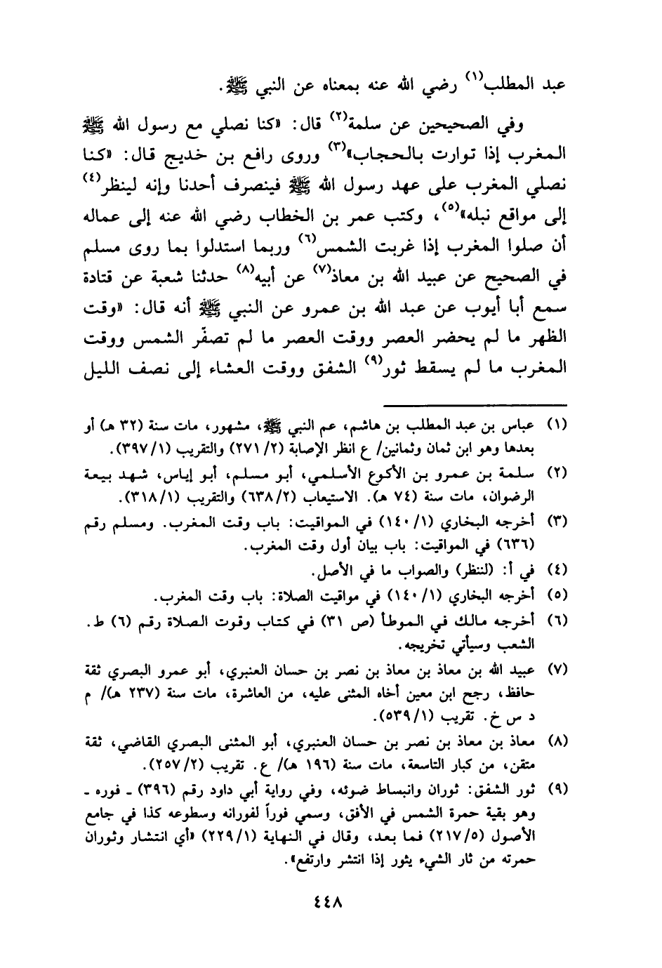 وَفِي الصَّحِيحَيْنِ عَن سَلمَة قَالَ: " كُنَّا نصلي مَعَ رَسُول الله - صَلَّى اللَّهُ عَلَيْهِ وَسَلَّم َ - الْمغرب إِذا تَوَارَتْ بالحجاب " وروى رَافع بن خديج قَالَ: " كُنَّا نصلي الْمغرب على عهد رَسُول الله - صَلَّى اللَّهُ عَلَيْهِ وَسَلَّم َ - فَيَنْصَرِف أَحَدنَا وَإنَّهُ لينْظر إِلَى مواقع نبله "، وَكتب عمر بن الْخطاب رَضِي الله عَنهُ إِلَى عماله أَن صلوا الْمغرب إِذا غربت الشَّمْس وَرُبمَا استدلوا بِمَا روى مُسلم فِي الصَّحِيح عَن عبيد الله بن معَاذ عَن أَبِيه حَدثنَا شُعْبَة عَن قَتَادَة سمع أَبَا أَيُّوب عَن عبد الله بن عَمْرو عَن النَّبِي - صَلَّى اللَّهُ عَلَيْهِ وَسَلَّم َ - أَنه قَالَ: " وَقت الظّهْر مَا لم يحضر الْعَصْر وَوقت الْعَصْر مَا لم تصفر الشَّمْس وَوقت الْمغرب مَا لم يسْقط ثَوْر الشَّفق وَوقت الْعشَاء إِلَى نصف اللَّيْل