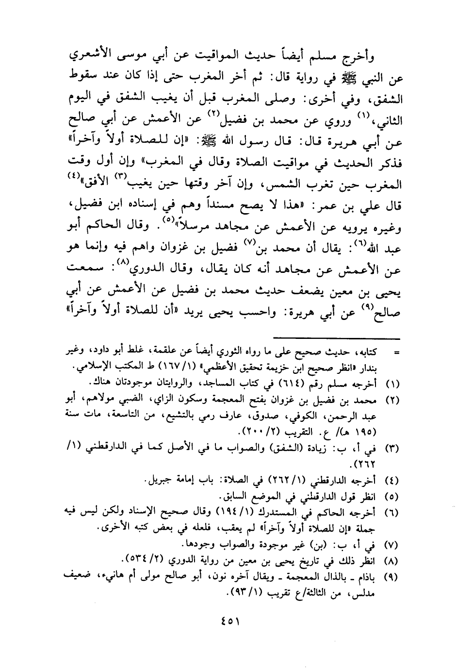 وَأخرج مُسلم أَيْضا حَدِيث الْمَوَاقِيت عَن أبي مُوسَى الْأَشْعَرِيّ عَن النَّبِي - صَلَّى اللَّهُ عَلَيْهِ وَسَلَّم َ - فِي رِوَايَة قَالَ: ثمَّ أخر الْمغرب حَتَّى إِذا كَانَ عِنْد سُقُوط الشَّفق، وَفِي أُخْرَى: وَصلى الْمغرب قبل أَن يغيب الشَّفق فِي الْيَوْم الثَّانِي، وَرُوِيَ عَن مُحَمَّد بن فُضَيْل عَن الْأَعْمَش عَن أبي صَالح عَن أبي هُرَيْرَة قَالَ: قَالَ رَسُول الله - صَلَّى اللَّهُ عَلَيْهِ وَسَلَّم َ -: " إِن للصَّلَاة أَولا وآخرا " فَذكر الحَدِيث فِي مَوَاقِيت الصَّلَاة وَقَالَ فِي الْمغرب " وَإِن أول وَقت الْمغرب حِين تغرب الشَّمْس، وَإِن آخر وَقتهَا حِين يغيب الْأُفق " قَالَ عَليّ بن عمر: " هَذَا لَا يَصح مُسْندًا وهم فِي إِسْنَاده ابْن فُضَيْل، وَغَيره يرويهِ عَن الْأَعْمَش عَن مُجَاهِد مُرْسلا ". وَقَالَ الْحَاكِم أَبُو عبد الله: يُقَال أَن مُحَمَّد بن فُضَيْل بن غَزوَان واهم فِيهِ وَإِنَّمَا هُوَ عَن الْأَعْمَش عَن مُجَاهِد أَنه كَانَ يُقَال، وَقَالَ الدوري: سَمِعت يحيى بن معِين يضعف حَدِيث مُحَمَّد بن فُضَيْل عَن الْأَعْمَش عَن أبي صَالح عَن أبي هُرَيْرَة: واحسب يحيى يُرِيد " أَن للصَّلَاة أَولا وآخرا "