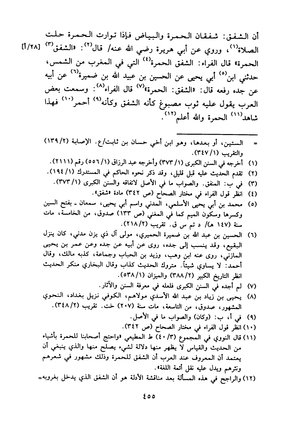 أَن الشَّفق: شفقان الْحمرَة وَالْبَيَاض فَإِذا تَوَارَتْ الْحمرَة حلت الصَّلَاة، وَرُوِيَ عَن أبي هُرَيْرَة رَضِي الله عَنهُ قَالَ: " الشَّفق الْحمرَة " قَالَ الْفراء: الشَّفق الْحمرَة الَّتِي فِي الْمغرب من الشَّمْس، حَدثنِي ابْن أبي يحيى عَن الْحُسَيْن بن عبيد الله بن ضميرَة عَن أَبِيه عَن جده رَفعه قَالَ: " الشَّفق: الْحمرَة " قَالَ الْفراء: وَسمعت بعض الْعَرَب يَقُول عَلَيْهِ ثوب مصبوغ كَأَنَّهُ الشَّفق وَكَأَنَّهُ أَحْمَر فَهَذَا شَاهد الْحمرَة وَالله أعلم.