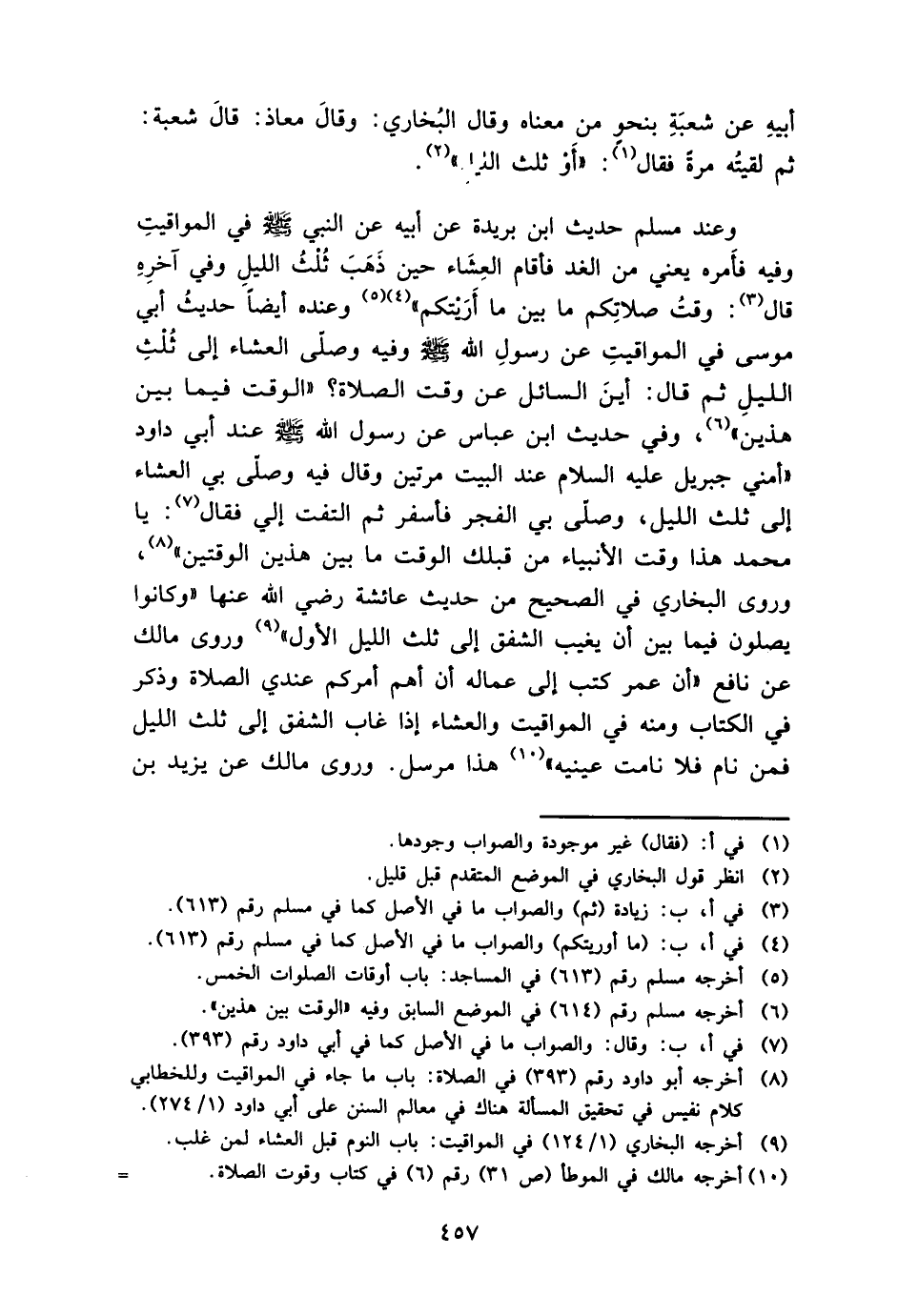 وَعند مُسلم حَدِيث ابْن بُرَيْدَة عَن أَبِيه عَن النَّبِي - صَلَّى اللَّهُ عَلَيْهِ وَسَلَّم َ - فِي الْمَوَاقِيت وَفِيه فَأمره يَعْنِي من الْغَد فَأَقَامَ الْعشَاء حِين ذهب ثلث اللَّيْل وَفِي آخِره قَالَ: وَقت صَلَاتكُمْ مَا بَين مَا أريتكم " وَعِنْده أَيْضا حَدِيث أبي مُوسَى فِي الْمَوَاقِيت عَن رَسُول الله - صَلَّى اللَّهُ عَلَيْهِ وَسَلَّم َ - وَفِيه وَصلى الْعشَاء إِلَى ثلث اللَّيْل ثمَّ قَالَ: أَيْن السَّائِل عَن وَقت الصَّلَاة؟ " الْوَقْت فِيمَا بَين هذَيْن "، وَفِي حَدِيث ابْن عَبَّاس عَن رَسُول الله - صَلَّى اللَّهُ عَلَيْهِ وَسَلَّم َ - عِنْد أبي دَاوُد " أمني جِبْرِيل عَلَيْهِ السَّلَام عِنْد الْبَيْت مرَّتَيْنِ وَقَالَ فِيهِ وَصلى بِي الْعشَاء إِلَى ثلث اللَّيْل، وَصلى بِي الْفجْر فأسفر ثمَّ الْتفت إِلَيّ فَقَالَ: يَا مُحَمَّد هَذَا وَقت الْأَنْبِيَاء من قبلك الْوَقْت مَا بَين هذَيْن الْوَقْتَيْنِ "، وروى البُخَارِيّ فِي الصَّحِيح من حَدِيث عَائِشَة رَضِي الله عَنْهَا " وَكَانُوا يصلونَ فِيمَا بَين أَن يغيب الشَّفق إِلَى ثلث اللَّيْل الأول " وروى مَالك عَن نَافِع " أَن عمر كتب إِلَى عماله أَن أهم أَمركُم عِنْدِي الصَّلَاة وَذكر فِي الْكتاب وَمِنْه فِي الْمَوَاقِيت وَالْعشَاء إِذا غَابَ الشَّفق إِلَى ثلث اللَّيْل فَمن نَام فَلَا نَامَتْ عَيْنَيْهِ " هَذَا مُرْسل. وروى مَالك عَن يزِيد بن