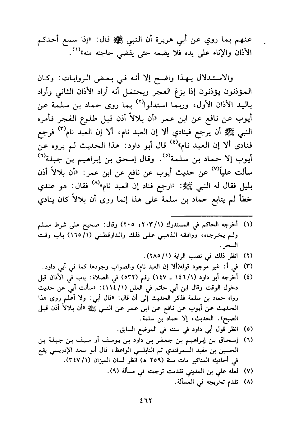 وَالِاسْتِدْلَال بِهَذَا وَاضح إِلَّا أَنه فِي بعض الرِّوَايَات: وَكَانَ المؤذنون يُؤذنُونَ إِذا بزغ الْفجْر وَيحْتَمل أَنه أَرَادَ الْأَذَان الثَّانِي وَأَرَادَ بِالْيَدِ الْأَذَان الأول، وَرُبمَا استدلوا بِمَا روى حَمَّاد بن سَلمَة عَن أَيُّوب عَن نَافِع عَن ابْن عمر " أَن بِلَالًا أذن قبل طُلُوع الْفجْر فَأمره النَّبِي - صَلَّى اللَّهُ عَلَيْهِ وَسَلَّم َ - أَن يرجع فينادي أَلا إِن العَبْد نَام، أَلا إِن العَبْد نَام فَرجع فَنَادَى أَلا إِن العَبْد نَام " قَالَ أَبُو دَاوُد: هَذَا الحَدِيث لم يروه عَن أَيُّوب إِلَّا حَمَّاد بن سَلمَة. وَقَالَ إِسْحَق بن إِبْرَاهِيم بن جبلة سَأَلت عليا عَن حَدِيث أَيُّوب عَن نَافِع عَن ابْن عمر: " أَن بِلَالًا أذن بلَيْل فَقَالَ لَهُ النَّبِي - صَلَّى اللَّهُ عَلَيْهِ وَسَلَّم َ -: " ارْجع فَنَادِ إِن العَبْد نَام " فَقَالَ: هُوَ عِنْدِي خطأ لم يُتَابع حَمَّاد بن سَلمَة على هَذَا إِنَّمَا روى أَن بِلَالًا كَانَ يُنَادي