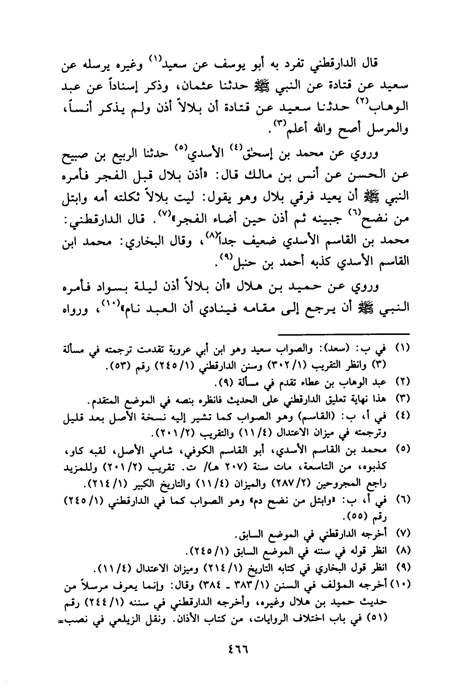 قَالَ الدَّارَقُطْنِيّ تفرد بِهِ أَبُو يُوسُف عَن سعيد وَغَيره يُرْسِلهُ عَن سعيد عَن قَتَادَة عَن النَّبِي - صَلَّى اللَّهُ عَلَيْهِ وَسَلَّم َ - حَدثنَا عُثْمَان، وَذكر إِسْنَادًا عَن عبد الْوَهَّاب حَدثنَا سعيد عَن قَتَادَة أَن بِلَالًا أذن وَلم يذكر أنسا، والمرسل أصح وَالله أعلم.