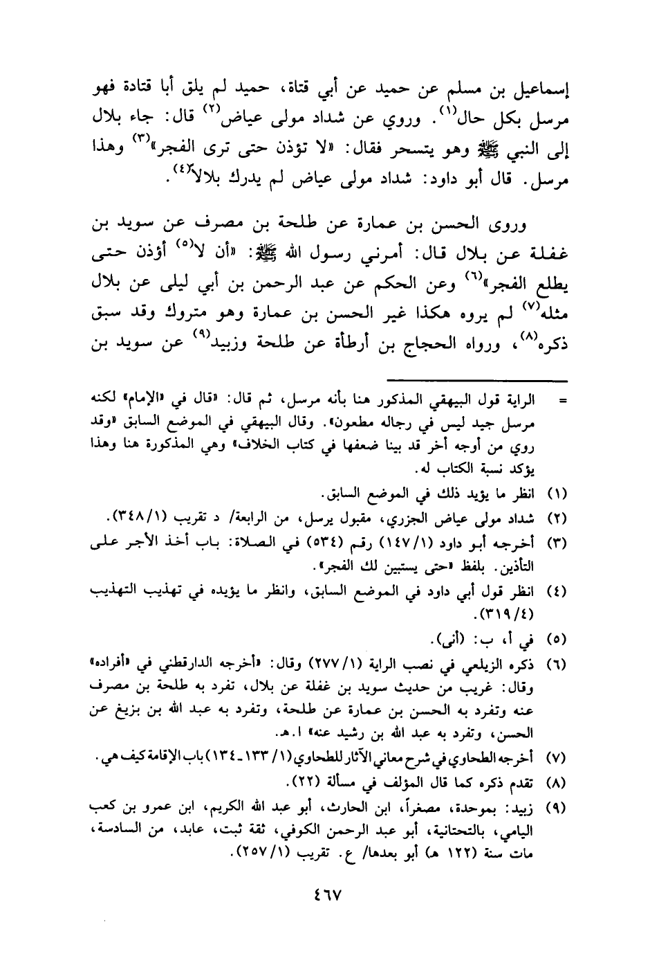 إِسْمَاعِيل بن مُسلم عَن حميد عَن أبي قتاده، حميد لم يلق أَبَا قَتَادَة فَهُوَ مُرْسل بِكُل حَال. وَرُوِيَ عَن شَدَّاد مولى عِيَاض قَالَ: جَاءَ بِلَال إِلَى النَّبِي - صَلَّى اللَّهُ عَلَيْهِ وَسَلَّم َ - وَهُوَ يتسحر فَقَالَ: " لَا تؤذن حَتَّى ترى الْفجْر " وَهَذَا مُرْسل. قَالَ أَبُو دَاوُد: شَدَّاد مولى عِيَاض لم يدْرك بِلَالًا.