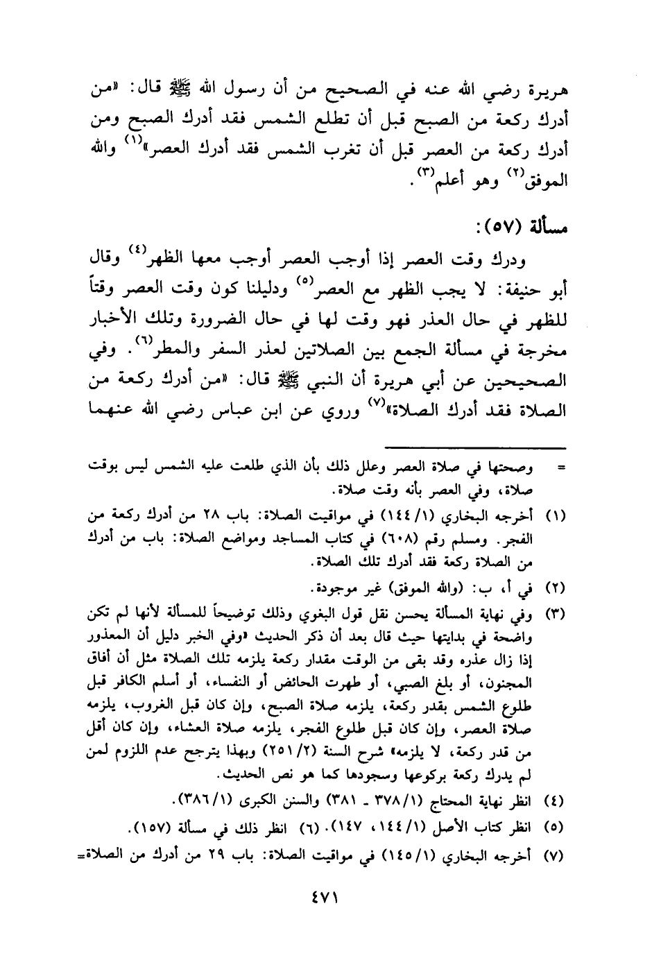 هُرَيْرَة رَضِي الله عَنهُ فِي الصَّحِيح من أَن رَسُول الله - صَلَّى اللَّهُ عَلَيْهِ وَسَلَّم َ - قَالَ: " من أدْرك رَكْعَة من الصُّبْح قبل أَن تطلع الشَّمْس فقد أدْرك الصُّبْح وَمن أدْرك رَكْعَة من الْعَصْر قبل أَن تغرب الشَّمْس فقد أدْرك الْعَصْر " وَالله الْمُوفق وَهُوَ أعلم.