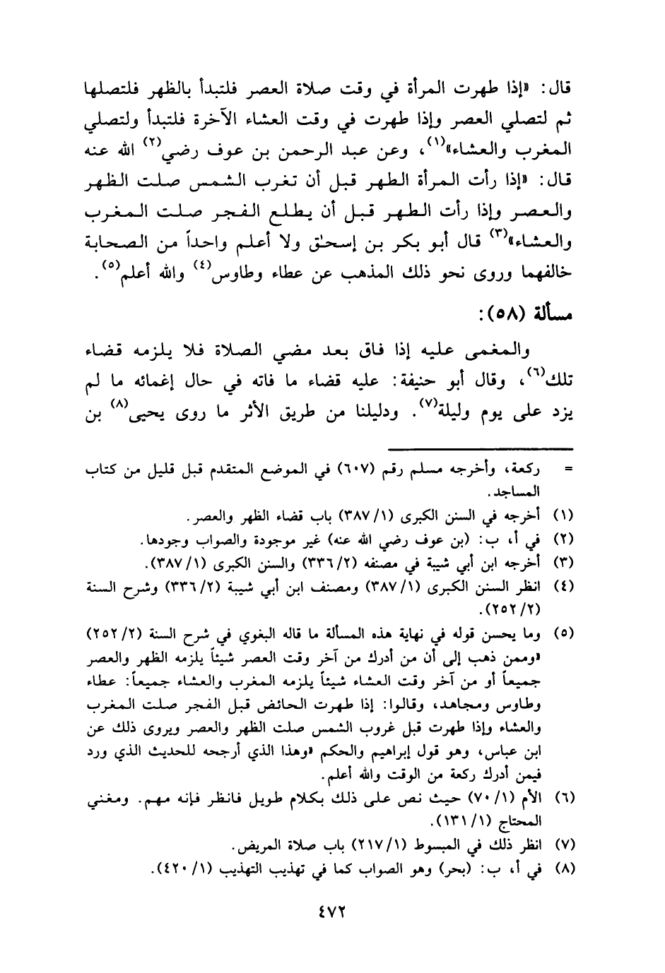 قَالَ: " إِذا طهرت الْمَرْأَة فِي وَقت صَلَاة الْعَصْر فلتبدأ بِالظّهْرِ فلتصلها ثمَّ لتصلي الْعَصْر وَإِذا طهرت فِي وَقت الْعشَاء الْآخِرَة فلتبدأ ولتصلي الْمغرب وَالْعشَاء "، وَعَن عبد الرَّحْمَن بن عَوْف رَضِي الله عَنهُ قَالَ: " إِذا رَأَتْ الْمَرْأَة الطُّهْر قبل أَن تغرب الشَّمْس صلت الظّهْر وَالْعصر وَإِذا رَأَتْ الطُّهْر قبل أَن يطلع الْفجْر صلت الْمغرب وَالْعشَاء " قَالَ أَبُو بكر بن إِسْحَق وَلَا أعلم وَاحِدًا من الصَّحَابَة خالفهما وروى نَحْو ذَلِك الْمَذْهَب عَن عَطاء وَطَاوُس وَالله أعلم.