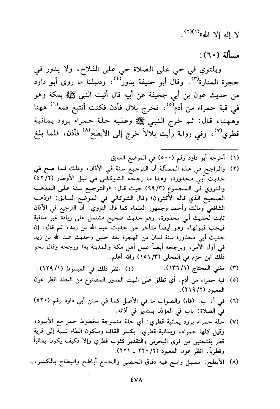 ويلتوي فِي حَيّ على الصَّلَاة حَيّ على الْفَلاح، وَلَا يَدُور فِي حجرَة المنارة. وَقَالَ أَبُو حنيفَة يَدُور، وَدَلِيلنَا مَا روى أَبُو دَاوُد من حَدِيث عون بن أبي جُحَيْفَة عَن أَبِيه قَالَ أتيت النَّبِي - صَلَّى اللَّهُ عَلَيْهِ وَسَلَّم َ - بِمَكَّة وَهُوَ فِي قبَّة حَمْرَاء من أَدَم، فَخرج بِلَال فَأذن فَكنت أتتبع فَمه هَهُنَا وَهَهُنَا، قَالَ: ثمَّ خرج النَّبِي - صَلَّى اللَّهُ عَلَيْهِ وَسَلَّم َ - وَعَلِيهِ حلَّة حَمْرَاء برود يَمَانِية قطري، وَفِي رِوَايَة رَأَيْت بِلَالًا خرج إِلَى الأبطح فَأذن، فَلَمَّا بلغ